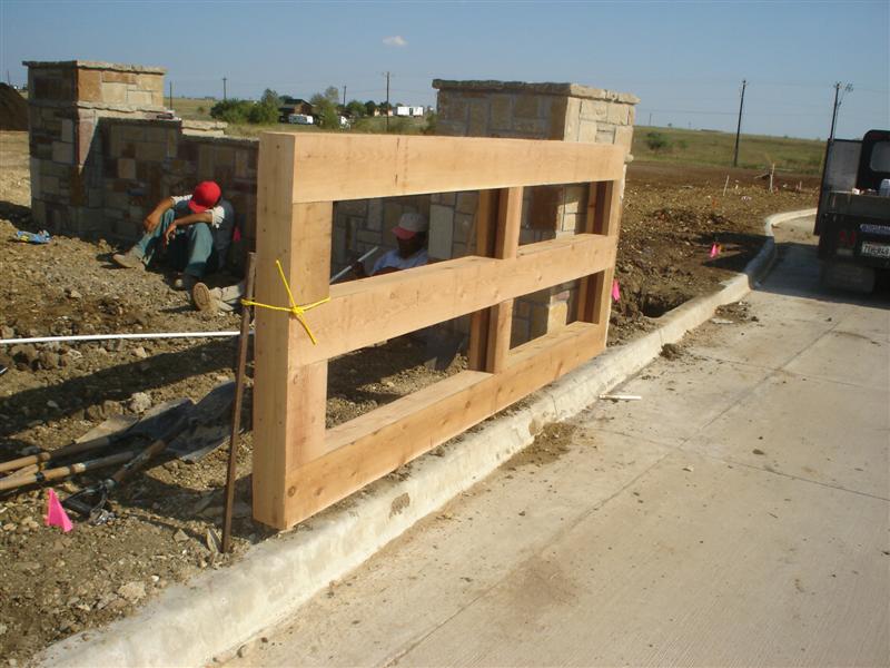 Running with your idea, what would a cement block wall look like with the native stone used for the cap and colums. Then between the colums, Don could use tile or maybe a cultured stone that would be easy to cut and shape into a series of pictures that reflects the wildlife on his ranch? He could use pebbles, sand, wood, glass or just about anything that he has on his land, or wants to buy.
