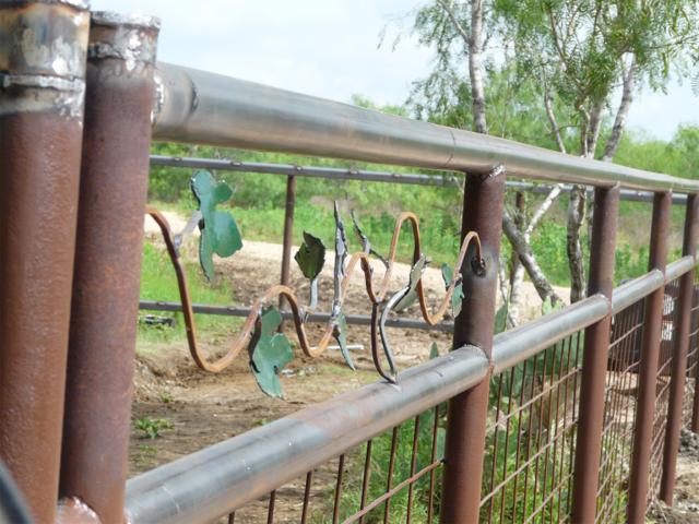 These past eight days have flown by. Today was bye day. But before Harvey left he started to put the icing on the cake. Remember the leaves I traced out on metal and Harvey cut out and Bobby and I welded stems to and the Harvey forged curves and texture to last week, (breath), well this morning before Harvey packed up, he attached a section to the entrance fence to see how it would look, IT LOOKS SO GOOD!
