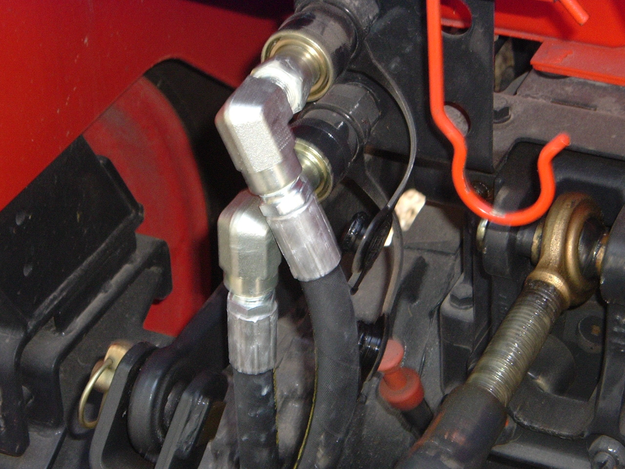 I came off the remotes with 90* fittings. Ran the hoses so they won't touch the 3 pt. lift arms and under the right side of cab where the other hyd. lines run. Went between the HST pedals (you have to be careful here so pedals don't rub on hoses when pushing them) then up the front of cab by the loader hose connections and followed the loader arms to the front. I also used the ready made hose from TSC. I did use 1/2" but 3/8" would work and be easier to run. I originally installed a mount bracket I bought at TSC that holds the hyd fittings but found it too hard to use so removed and let last couple feet of hose hang free. Zip tied every foot or so to keep hoses from moving. The 14' was just enough to get the hose to where you see it on the loader. I also used inline restrictors from GreensMachine at the cylinder end. It can be used without them, just moves faster.