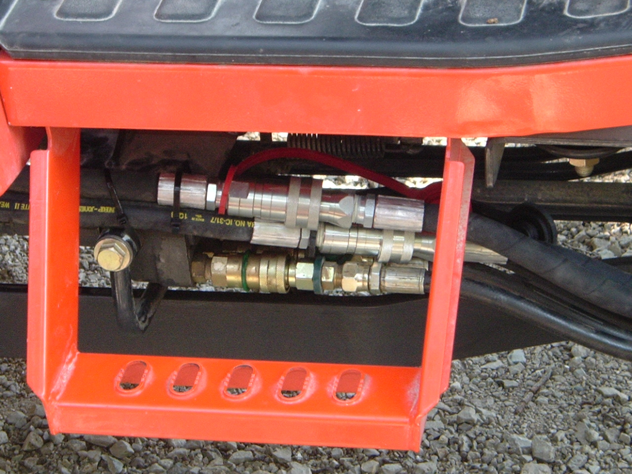 I put a set of QD"s just before the hoses get to the loader tower. Just right where the OEM hoses for the loader connect up. So I have 6 hoses in that location instead of 4. Makes it easy when you want to take your loader completely off. I just use a bungee cord for hose control. it seems to work well. I tie-wrapped one end of the bungee to the hoses mid span, and the other end goes up to a fitting on the loader, an holds everything clear. I used a home made (pieces of metal off of a kubota) bracket welded to the cover that goes over the torque tube. Of course I took it off to weld and paint.:)