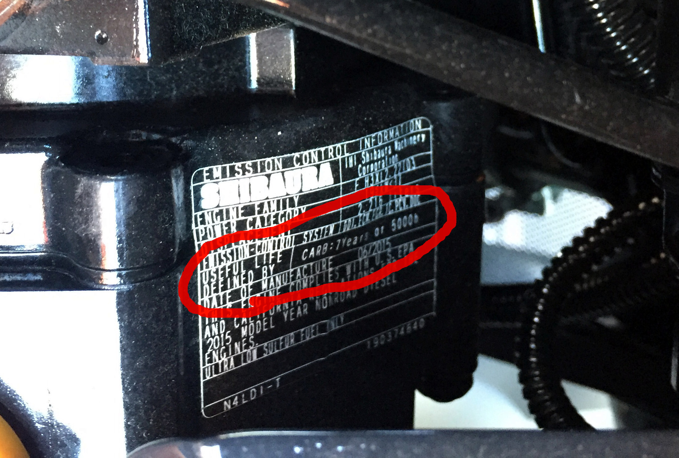 That engine emission info label notes all of the equipment Shibaura uses in its Tier 4 complaint system. (PCV, EGR, DOC, ECM, etc...). It states that it is EPA and CARB compliant. The next line under the listing of control mechanisms states how long that Shibaura and CARB, (California Air Resource Board), believe that system will effectively control the emissions to within the specifications required for Tier 4. (Its useful life). In the case of this type of engine, it is possible that the catalytic converter itself may not be converting all of the noxious gasses 100% into water and other non offensive compounds and elements after 7 years of use, or 5000 hours. However, barring abuse through dumping solids into the exhaust manifold, (sediment from deep water submersion, running in dirt with no air filter, etc...), the device itself should not be compromised, and exhaust gasses should still be flowing freely through the DOC, (Cat - in old man car terms), and it will simply be less effective at converting the gasses as time passes on. I do not believe there would be any performance drop.