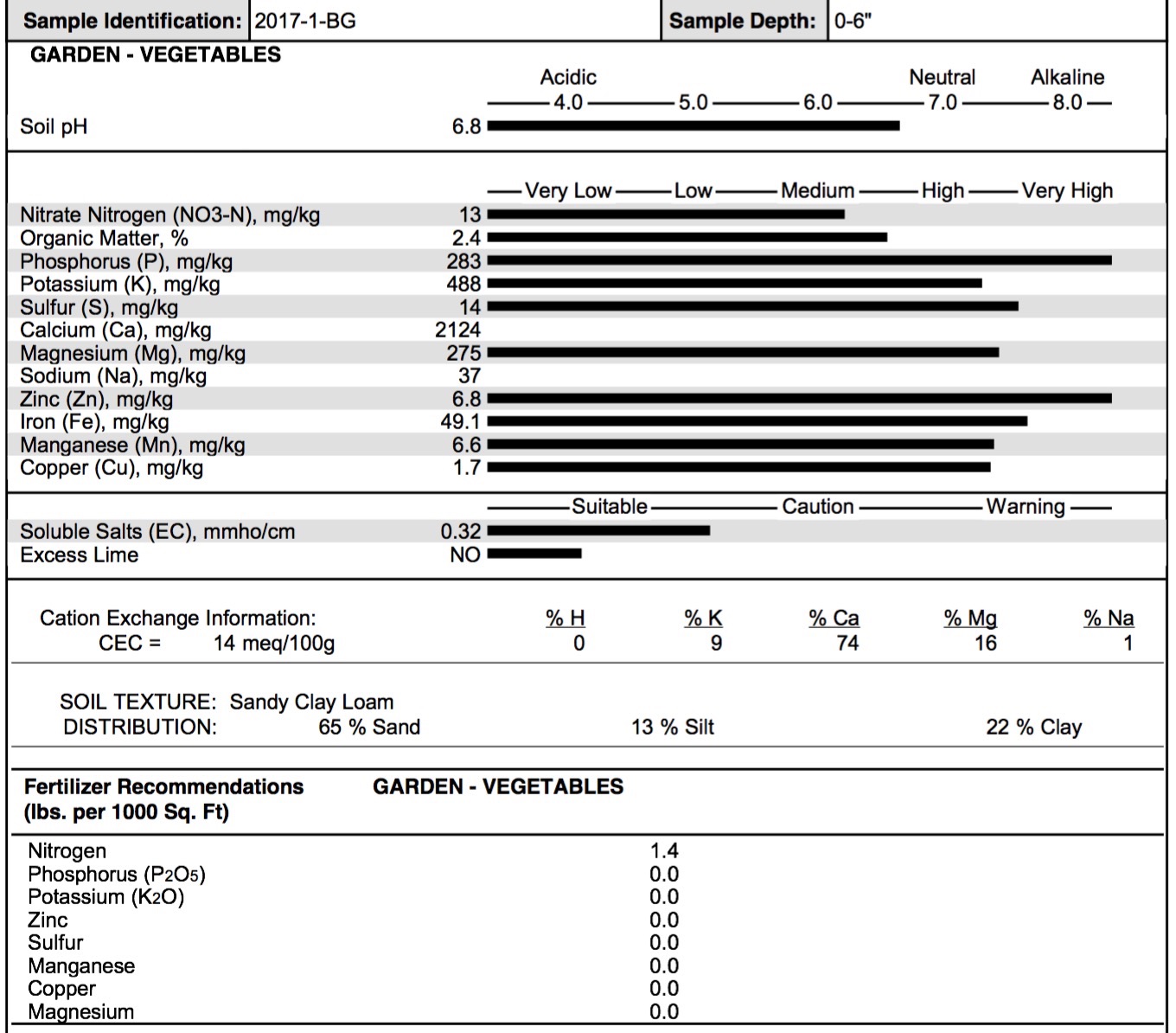 The soil samples look pretty good imo. More organic matter would help and can be added each year to improve the moisture holding characteristics of the soil. Looks like nitrogen is about all you need and I would be careful not to over do it. I would consider adding some Aspen chips or saw dust to help retain some moisture, that would help. Spread a thick layer and till them in as deep as you can.