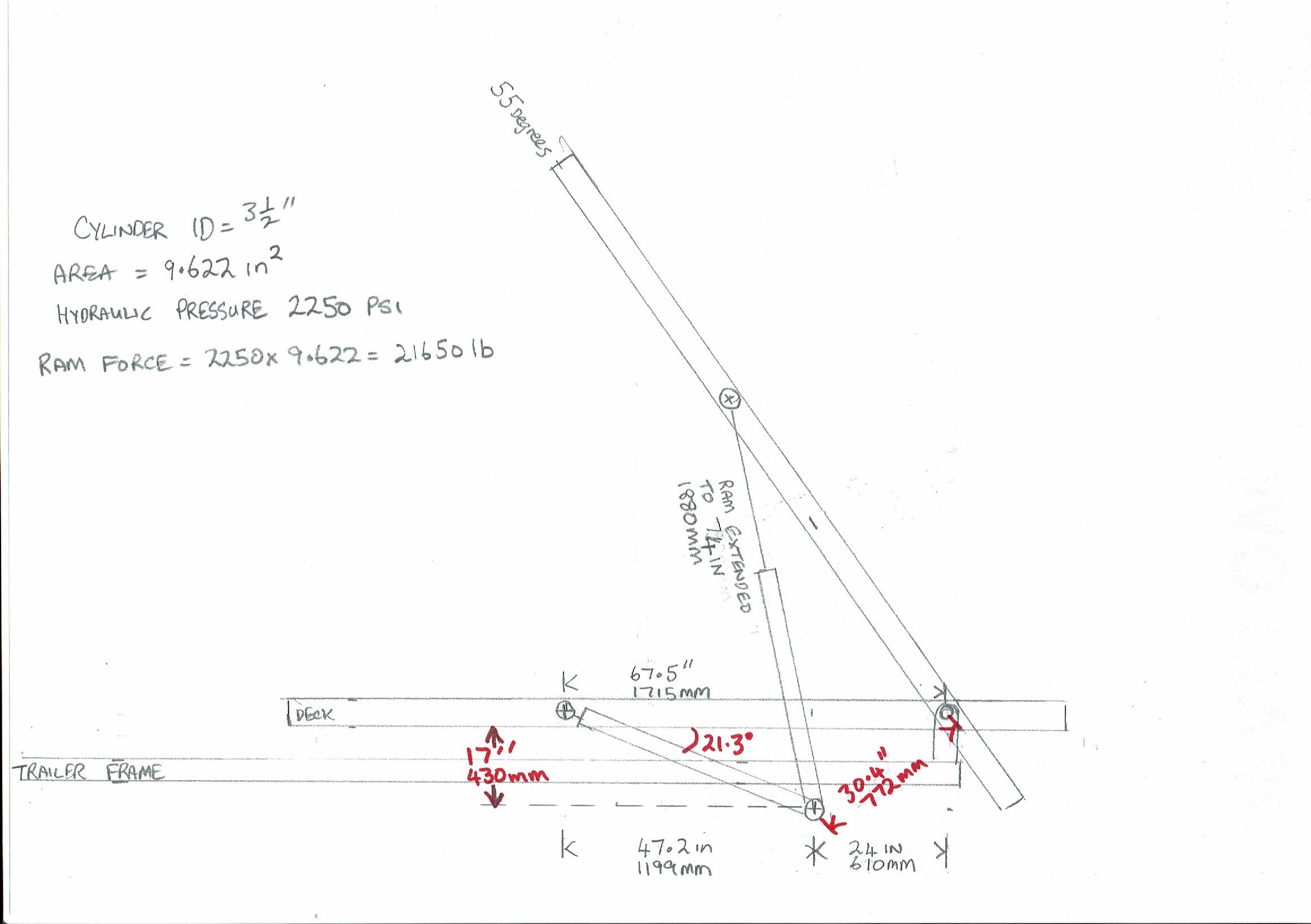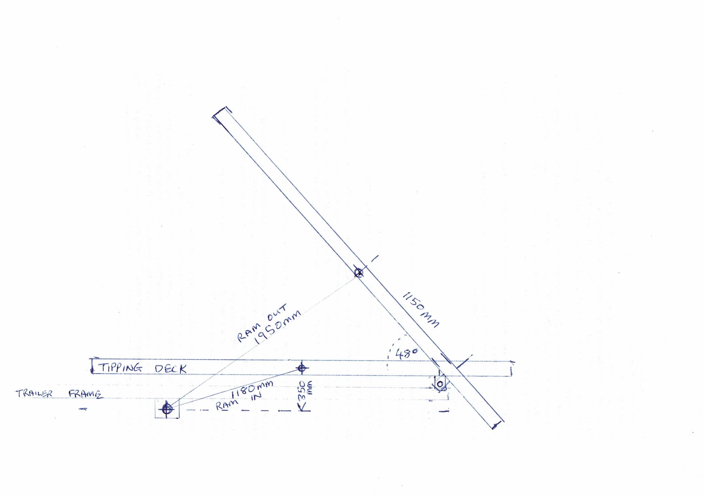 Regarding Redmans post. Thanks - I had not thought of putting the ram 'laid forward' so I have redrawn it that way in a scale drawing and with a 55 degree tipping angle. The drawing is attached at bottom of the text. By temporarily positioning the cylinder on blocks under the trailer I have also figured out that I can get the cylinder bottom mounting point 17 inches (430mm) vertically lower than where the top of the cylinder mounts on the tipping deck. I think this improves the angles and therefore has more lift.