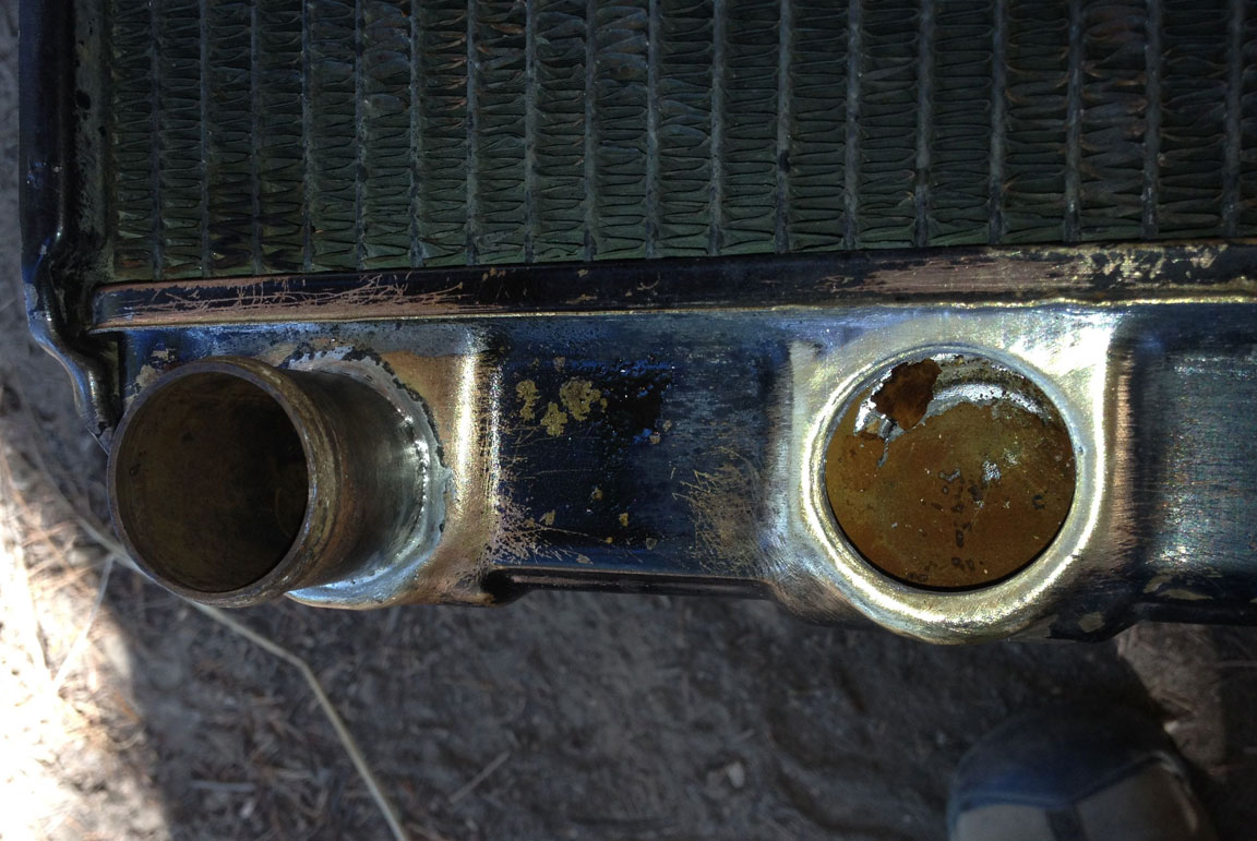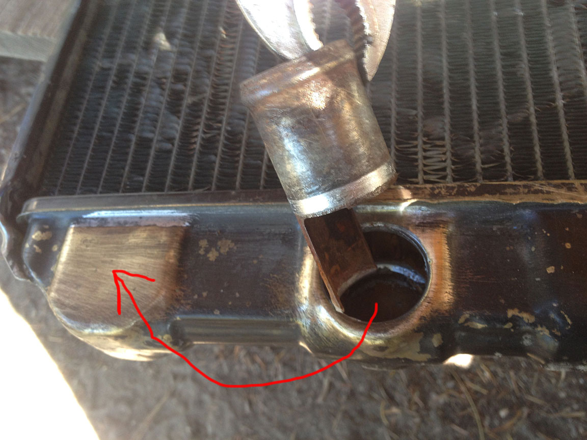 A big thing to watch is that you don't melt the joint where the top/bottom tank is soldered to the core. If you melt it, and it will probably happen where the pipe is close to the core, just wipe it with a brush full of flux, getting it nice and shiny, and come back with solder there too.