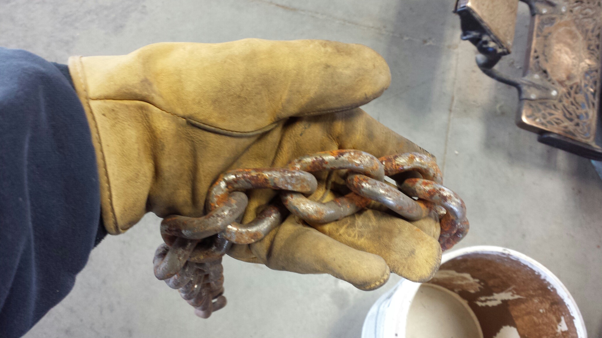 Just took off the 4-link roller chains from my B2320. I hung them in the shed on 20d nails driven into the wall studs at 45 degrees. No prob. I hang the 20 foot 3/8 logging chain that way too.