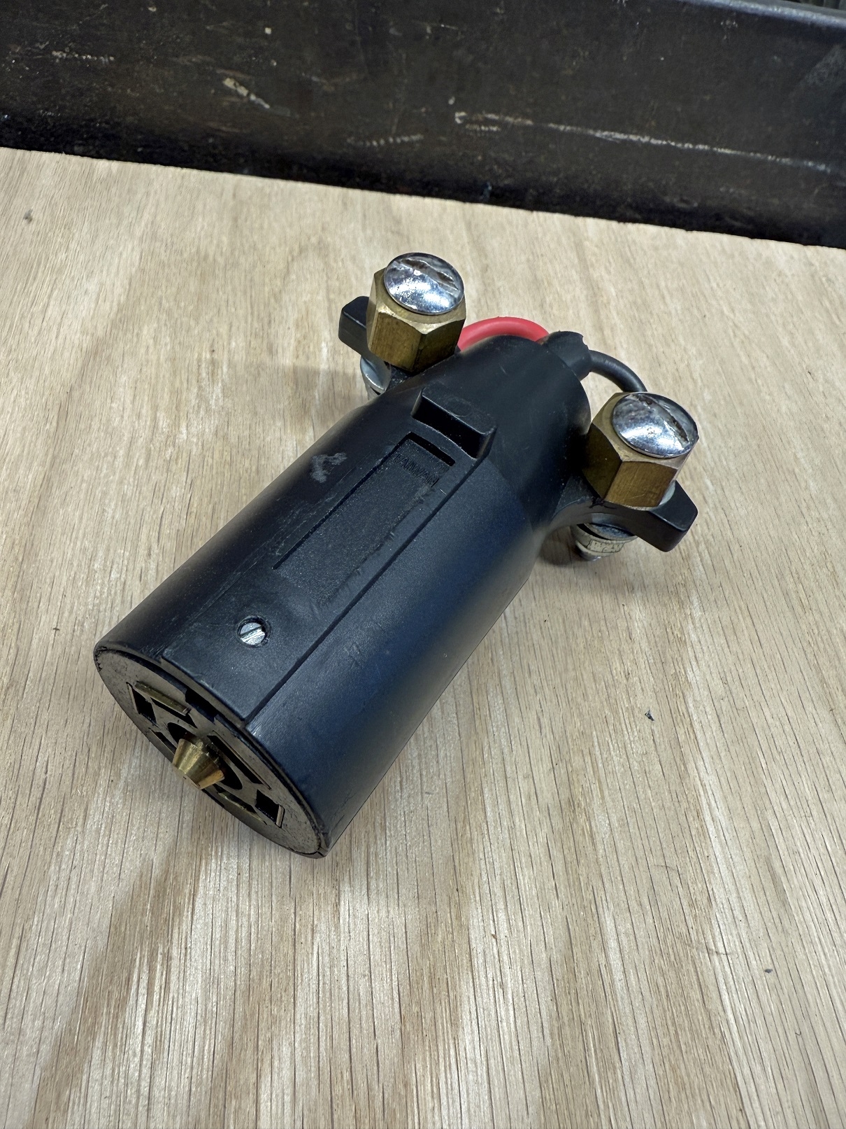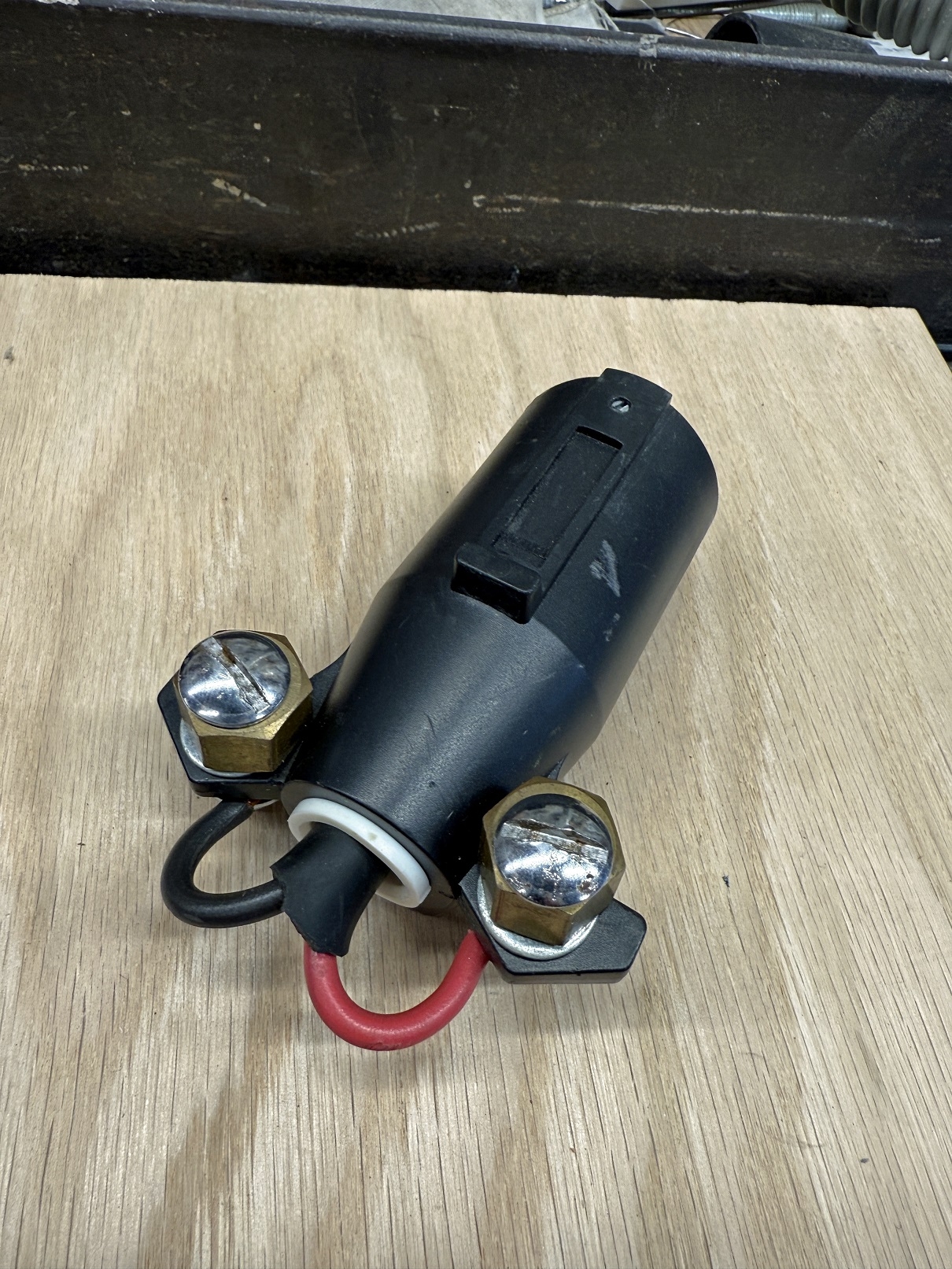Instead of having to pop the hood to connect the compressor to the battery, I made up this adapter that plugs into the vehicle trailer wiring harness socket. Makes a convenient place to attach the compressor alligator clips. It's a standard 7 pin connector, wired to the 30A trailer aux circuit which is protected by the OEM under hood circuit breaker.