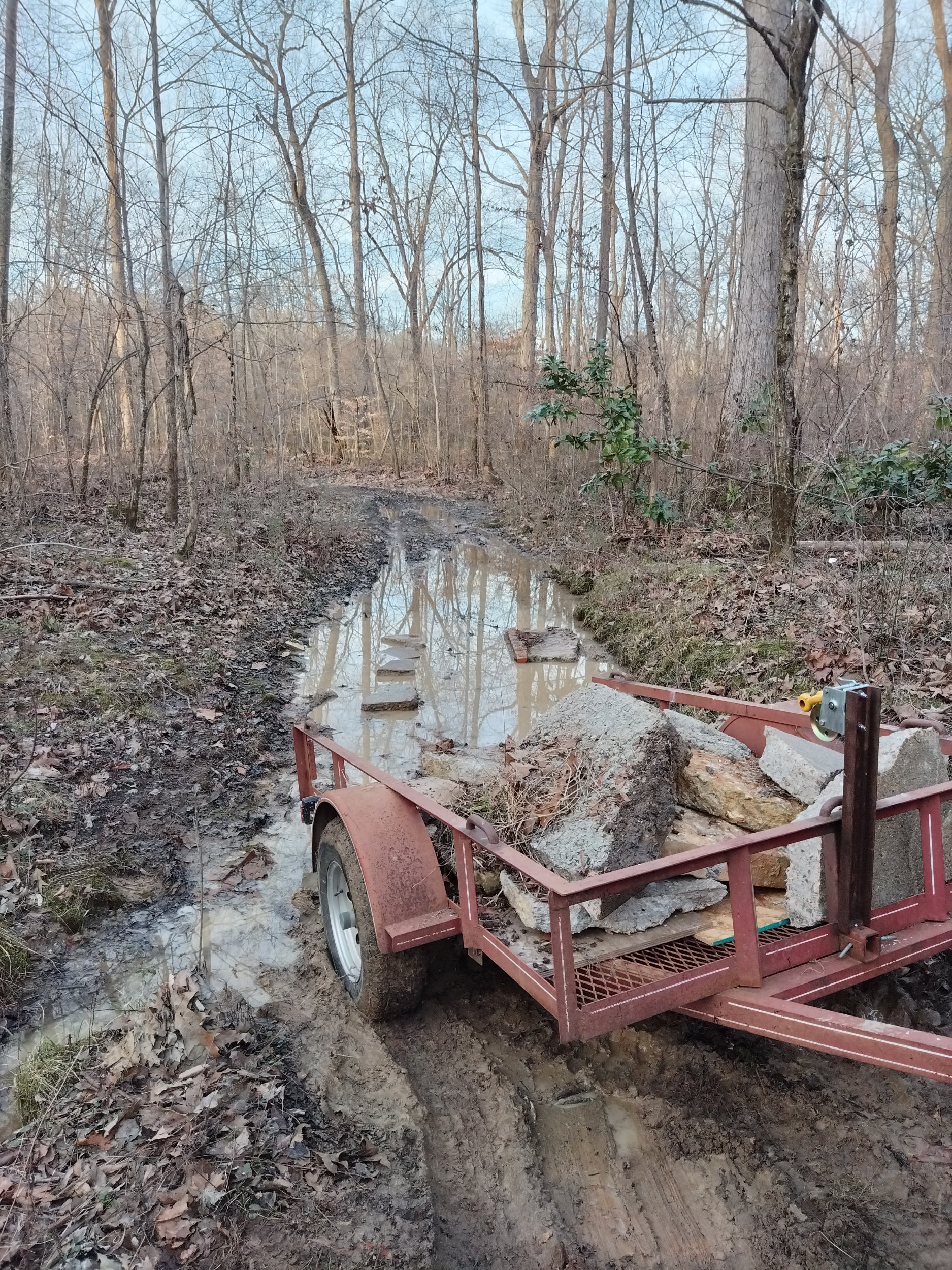 This is in a creek bottom area of my property that is swampy (obviously) and it floods 2-7 times a year depending on rainfall. So there is no real way to keep the water out of this area. Nor is it easy to drain as this is pretty much a low spot. Excess water does drain out one side of it and my goal it to help that process a long but there is only so much I can do there. The only real solution is to build it up. My plan is to use free concrete chunks to fill and raise the area so I am not driving through the mud hole. Luckily the mud isn't bottomless, it has a pretty hard bottom and the initial brick and cinder chunks help with that. Unfortunately, this is only an area that my tractor or SxS can get into. It would be a big ask to have a dump truck drive to back down there. So the majority of these concrete chunks will have to be placed by hand from the trailer I back down there.