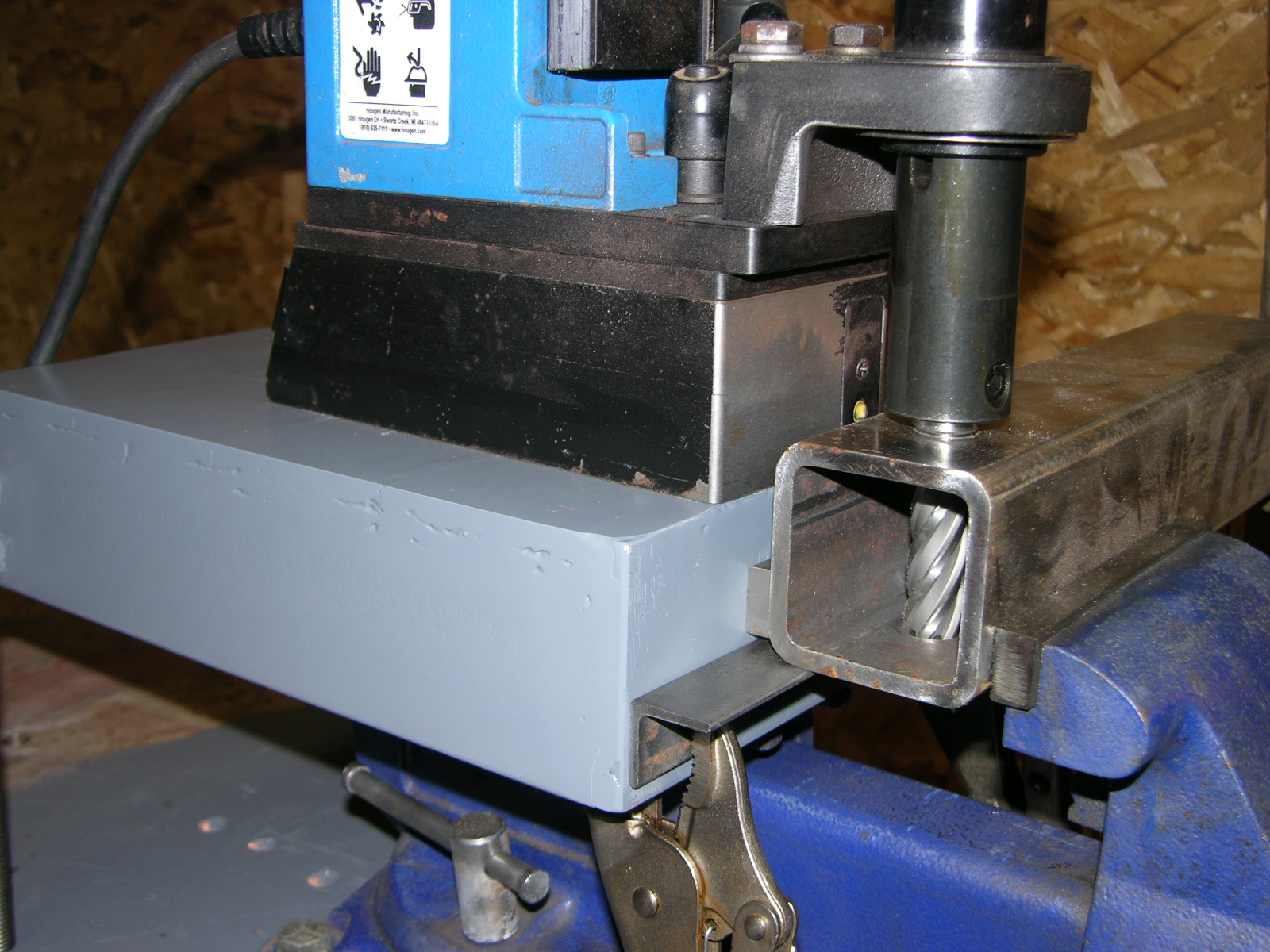 They all fit any/several of the 7 receivers I added to the FEL bucket on the old 580B, as well as any normal vehicle receiver if necessary - the receiver tube in the vise with a cutter in the hole doesn't show the OTHER end of that tube, which has a piece of scrap 1/2" FB clamped in it as a depth stop - so I can make any number of males at a time, and have ALL of them drilled in exactly the same distance from the end. This guarantees that ALL the pieces will fit ANY of the others, even if you flip one over.