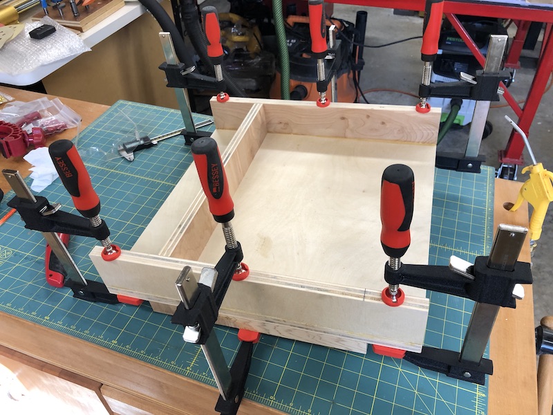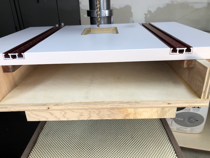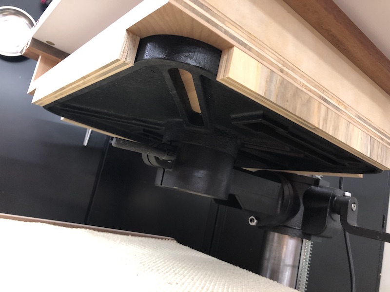 Thanks... this afternoon I got busy with the drill press table top. I bought a Woodpecker precision top but the increased table size interferes with the lift handle. Came up with a maybe brilliant solution at least in my mind. I wanted to be able to remove it quickly without threaded fasteners. Built a box that snugly fits over the cast table...^^^^ very nice, looks handy.
