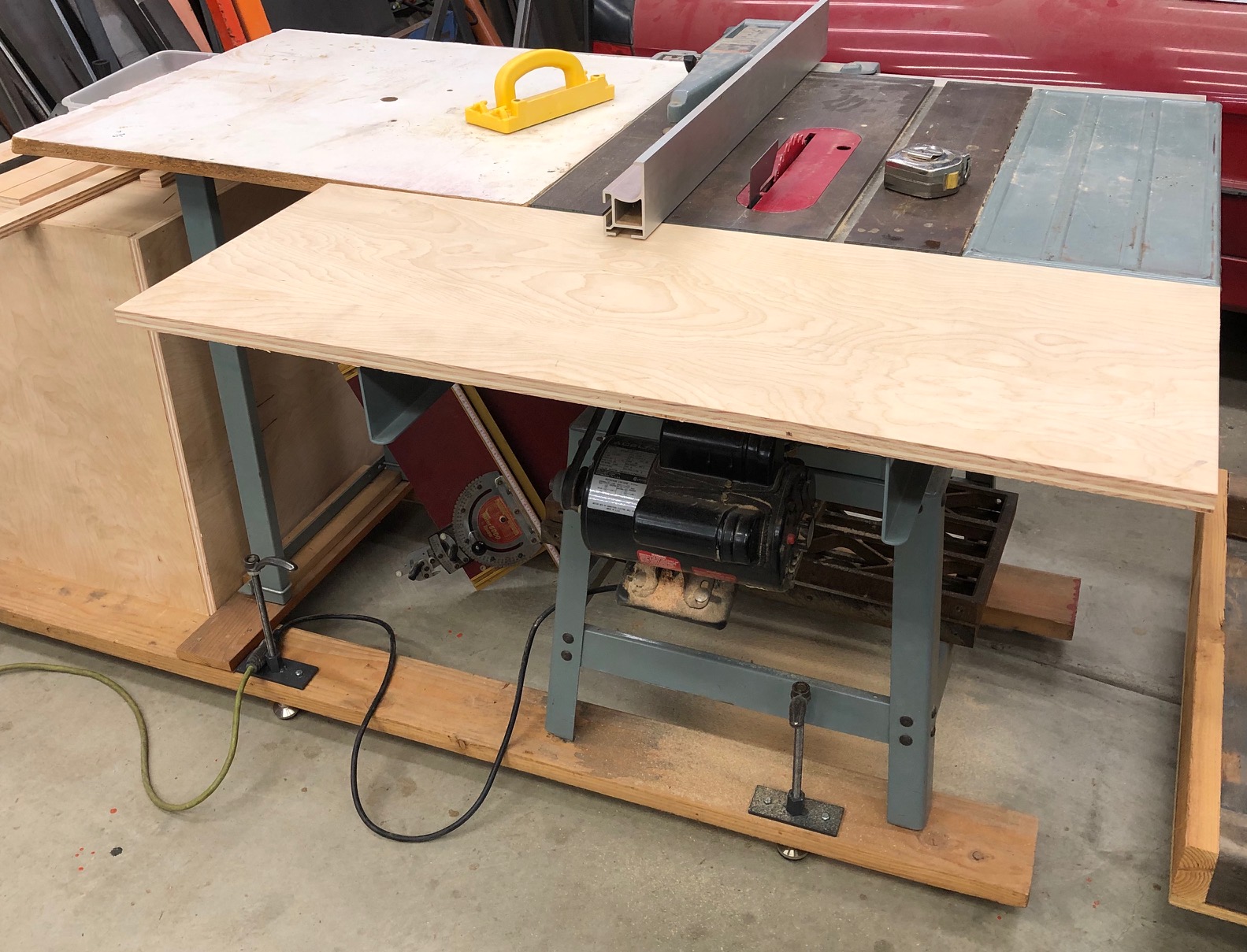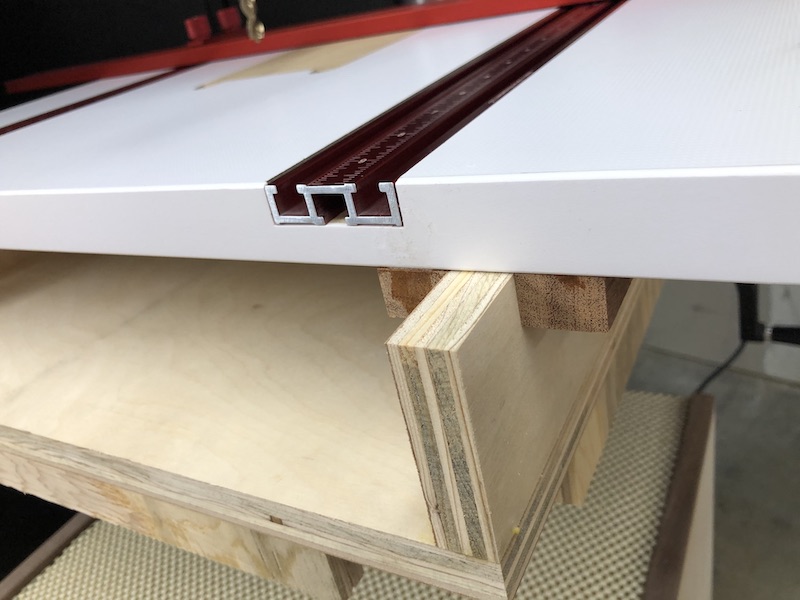 My goal was not to hard fasten the box to the existing table, or the woodworking table to the box, so I created hardwood slides allowing me to move the table fore/aft as well as being able to swing it side to side thus utilizing more of the sacrificial inset backing plate.