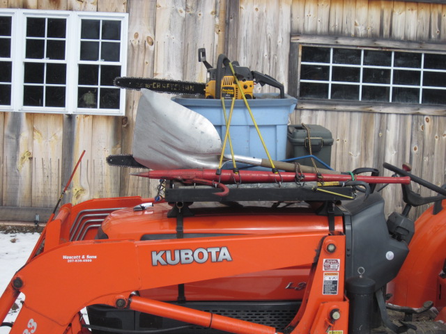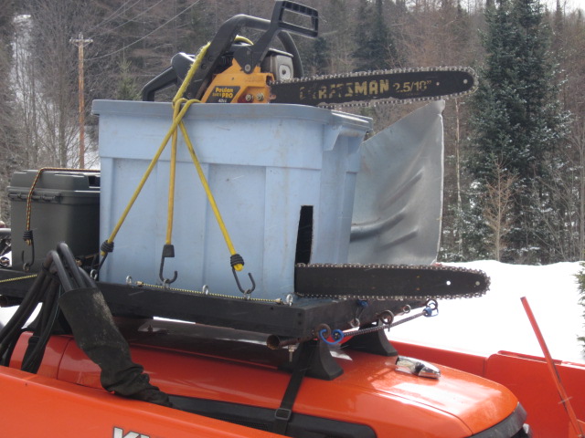 I looked around for a place to carry shovels, rakes, and even chainsaws, without interfering with the bucket or 3ph. I decided that the area over the hood was an untapped resource. I modified a set of car-top carrier brackets to fit, and bolted on a piece of flakeboard with a 1x2 edge. Added lots of screw eyes for bungee cords. It's amazing how much can be carried there, and it's right up where you can keep an eye on it.
