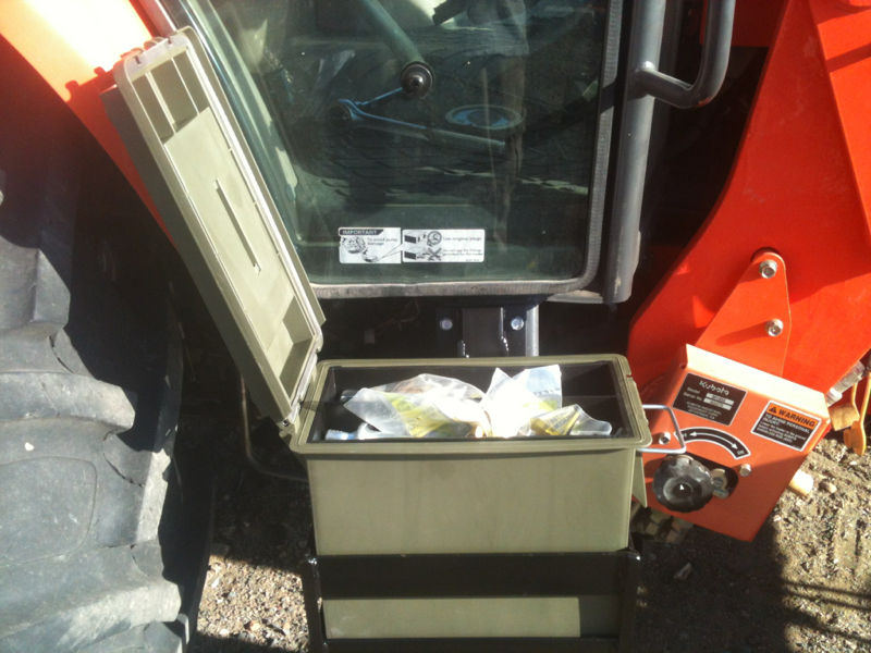 I purchased a M7040 cab earlier this year, and it came with a cheesy little plastic toolbox between the front left tire and the steps. I set the tires about 4" wider, and now the tires hit the toolbox.