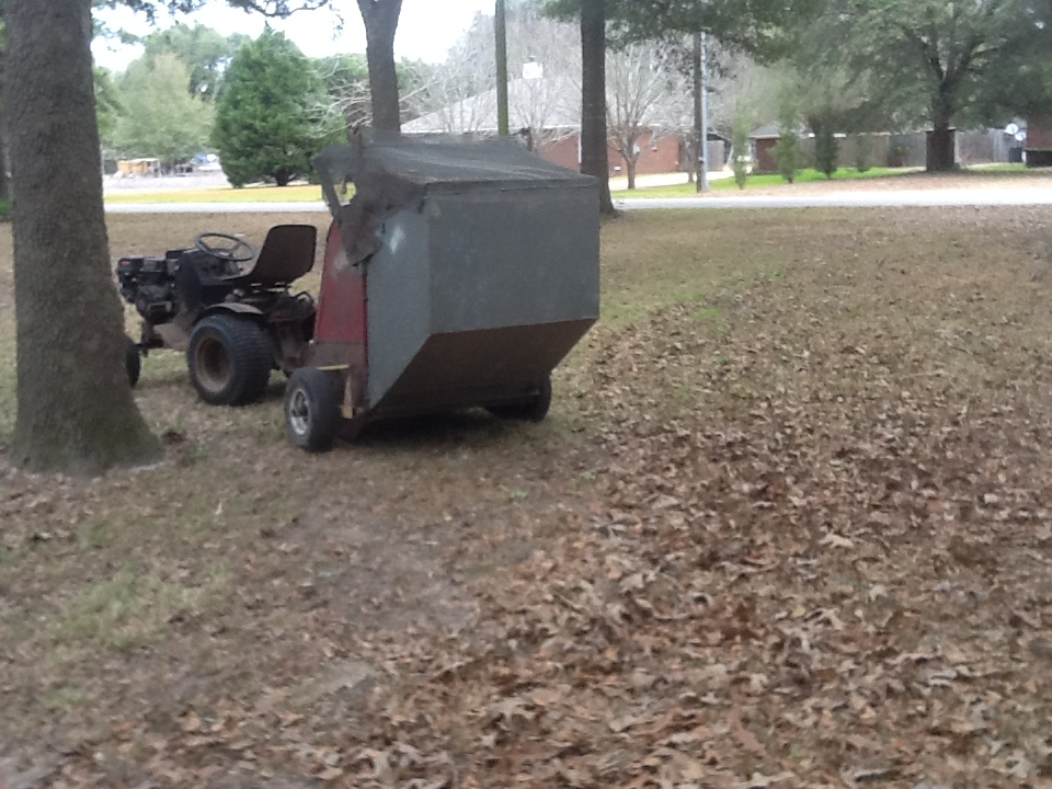 I just finished doing the front yard only. The front is the smallest, then the side is about 50% bigger, then the back is twice the size. For the front, three trips in the 44 bushel hopper of accumulated leaves.