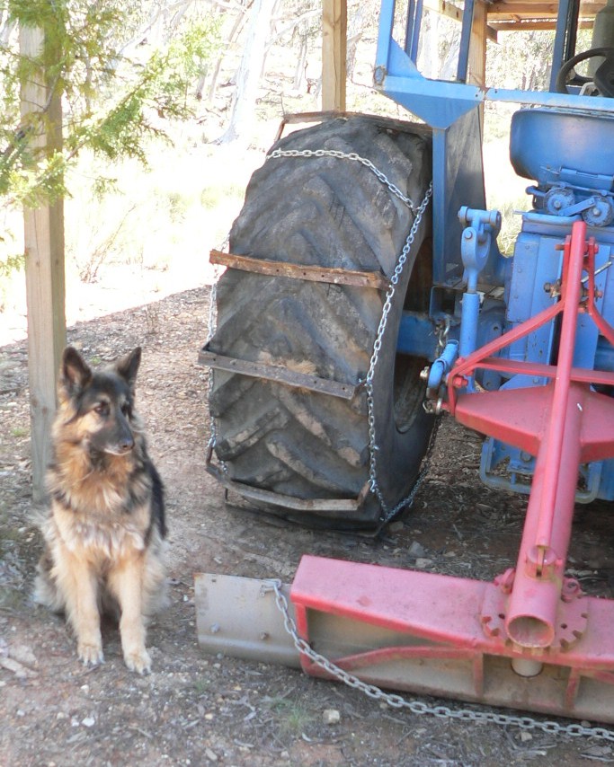 The result is good - plenty of traction, no side slip and best of all - a total cost of about $90 for chain and shackles. In one picture, you will see the tractor-driver's boss - Jenna, sitting proudly next to the wheel. If I had followed her instructions in the first place, the job would have been far easier