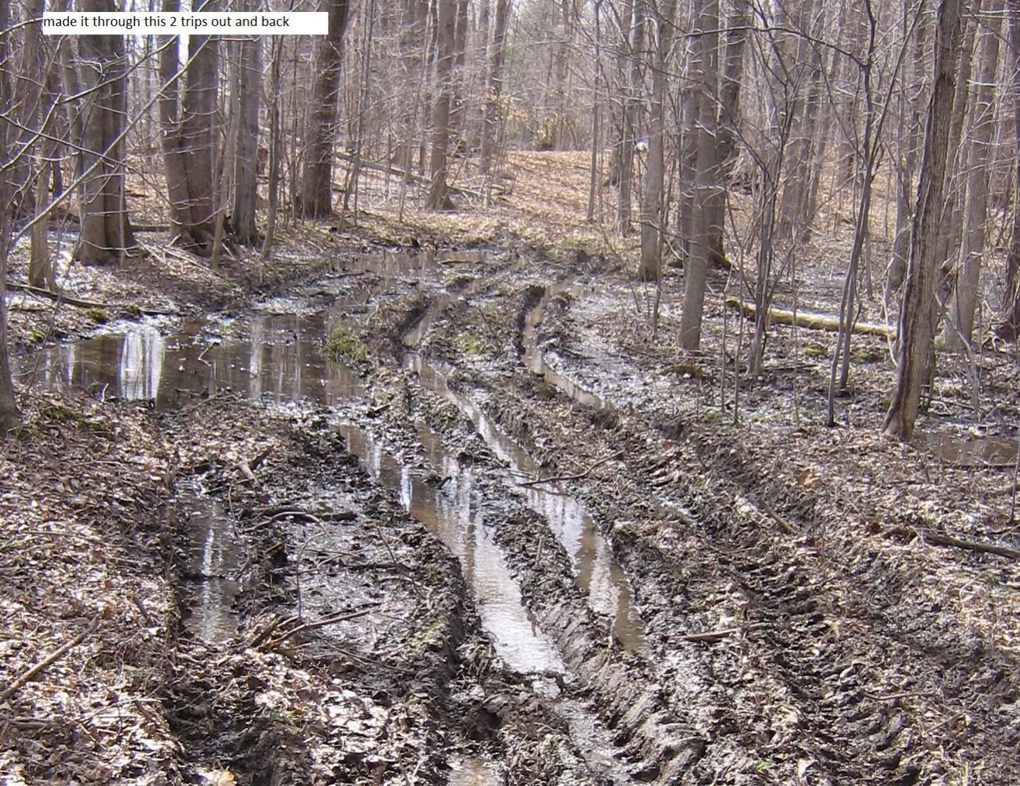 You don't really need full-sized logs for the corduroy section. I've done just fine with brush and branches; you just need quite a few to make a good matting to drive on. Consider it an organic version of the steel matting they used for quick runways on soft ground for aircraft back in WWII. (Actually, they were still using steel matting for Rapid Runway Repair back in the 1990s, don't know what they're using today.) Go Pink Ponies!