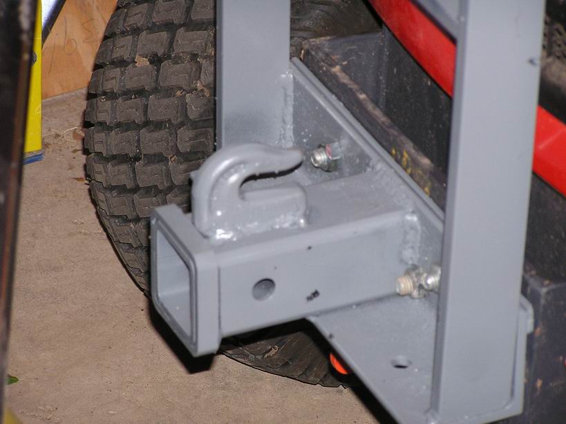 If you guys want to build a front blade, you might want to incorporate something I just did to my grill guard: I welded in a receiver hitch to carry a homemade weight box. If you did that, along with some other mounting hardware up higher for lifting, etc, you might have something that could handle the blade, and handle the stress of hitting a solid object without tearing up your tractor. See the pic of what I did.