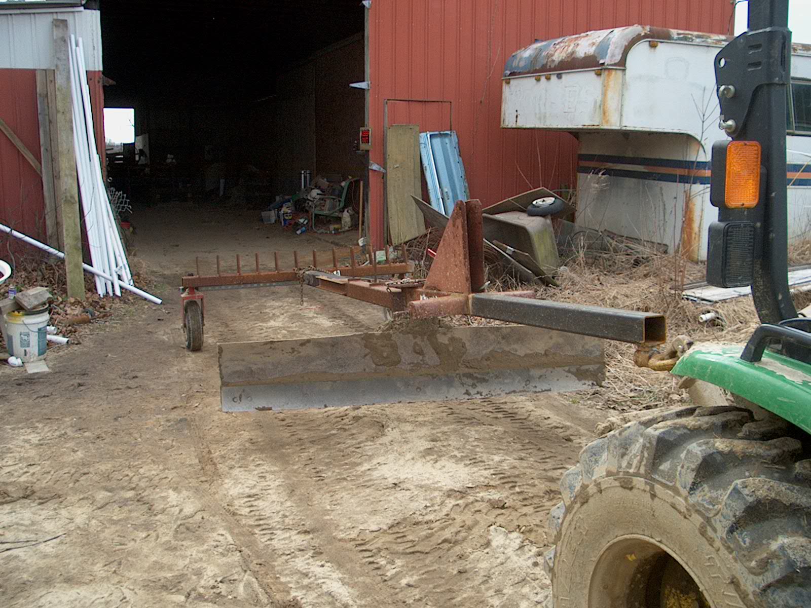 Renze about 9 years ago I got an old frame off a Deere combine. it was a frame and a n axle and a little more. I was about out of college and needed some cash to buy a lathe. I had a fella come by that had seen some pictures down south of some pull graders they used in the feilds. He wantd one to do their duck hunting land roads and levees. I built the frame out of 2by 3 tubing and had a blade made from and old bank sloper from a grader. it was about 10 feet. I used a clevis hitch for a thick drawbar, and I built it where the 2 lift arms did all the lifting because he only had 3 circuits to run everything. I built a somple pivot pin to angle the blade with one cylinder to run it. Then the other I weled in the combine rear frame and axle pivot to the grader frame. Since the clevis hitch was made of pipe we made it swivel. We then added a cyliner attached to the axle and the frame. That gave it a tilt. James wanted me to stationary the combines steering so I tacked it shut and we angeled the blade the blade would slie the whole implement over then I backed it a bac into the shop and ground off the tacks and bolted the combines steering cyliner back into place. When grading and angleing the blade you could steer opposite of the leading aedge of the blade sort of like the way a graders wheel lean works. Our unit looked alot like the Hoelscher rig with a ladder type frame. I used it a few times testing it by steering into the ditch with the grader and angling my blade back to a perpendicular position to the ditch. I did want to add a hydraulic side shift like a grader. I bought an old Grader whe scrap dropped off its and Austing Western I think and had a scarifier and good drawbar and mold board. the rest is picked over. It still has the hydraulic side shift and turn circle. I thought of makin a larger unit to go on the D5 at work for dressing our haul roads.