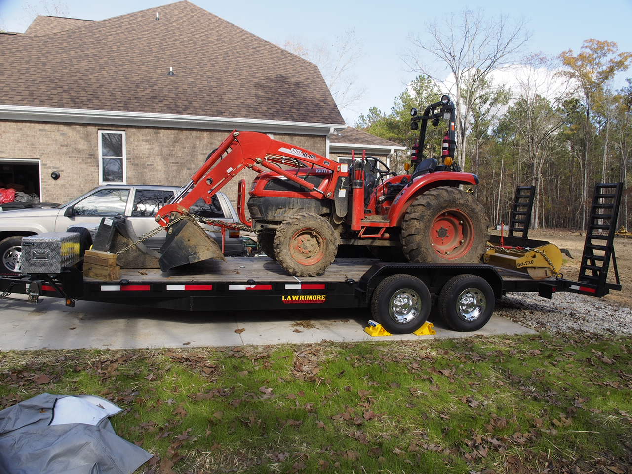 Note the thin white line on the deck by the tractor's front wheels. I have moved the tractor back a little bit from normal to compensate for the weight of the stump bucket forward of the tractor. Bucket is strapped down out of view and the tractor bucket sitting on top of it and chained down. Weight of ~ 15% - 18% on tongue is my norm.