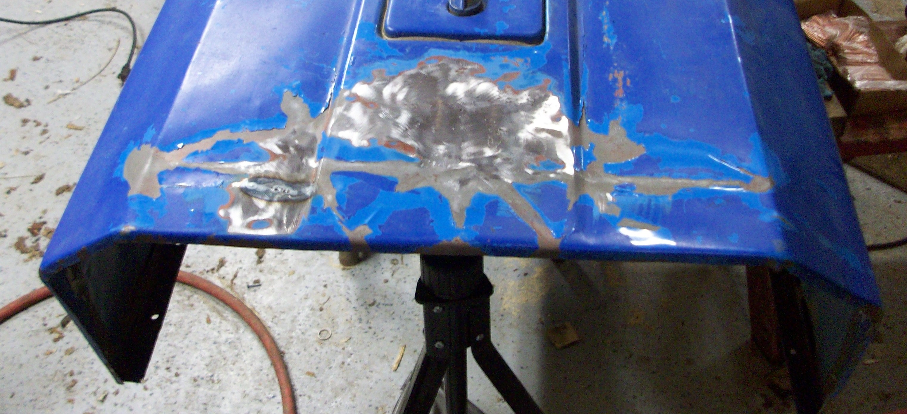 the hood so far-the metal was stretched so bad that hammer dolly/torch- wet towel wasn't enough. Finally used a 3" cut off tool then pressed it on the log splitter then mig welded and ground it down. anyway here's how it looks so far , Thanks for the input, and you guys are right on the mark there's definitely bondo or Short strand fiberglass in its future