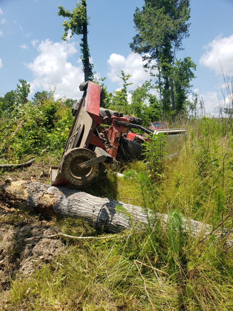 Actually can't say exactly. Trying to go over downed tree and also got on top of the stump hidden in tall grass. It made a hard turn and went over.