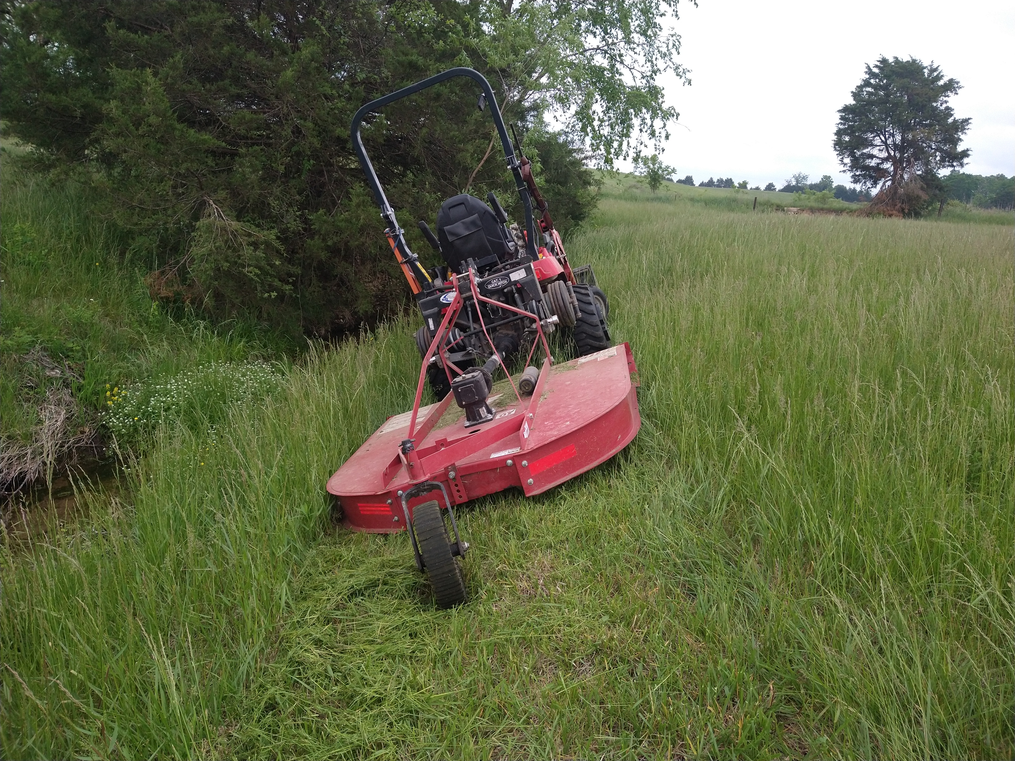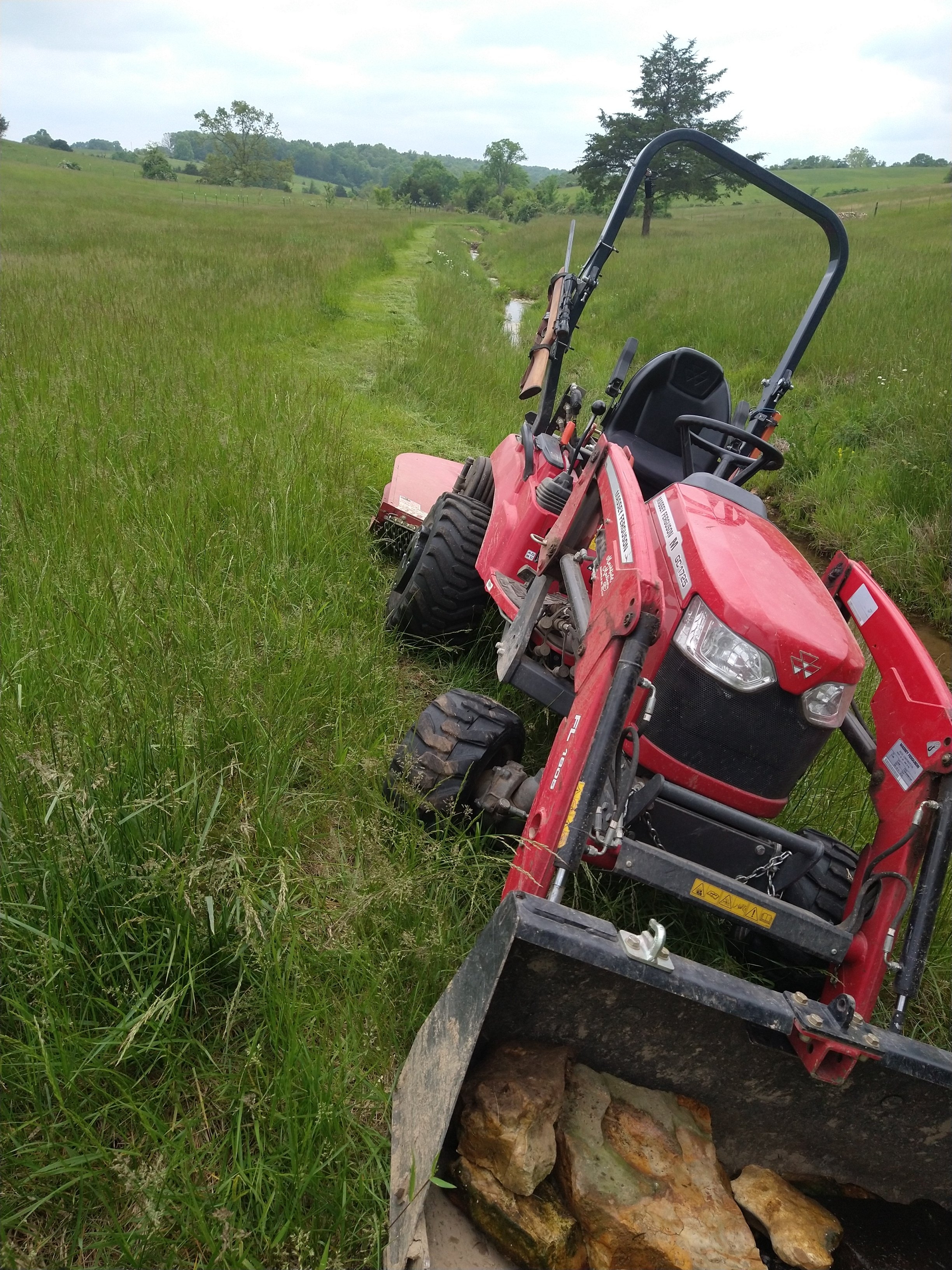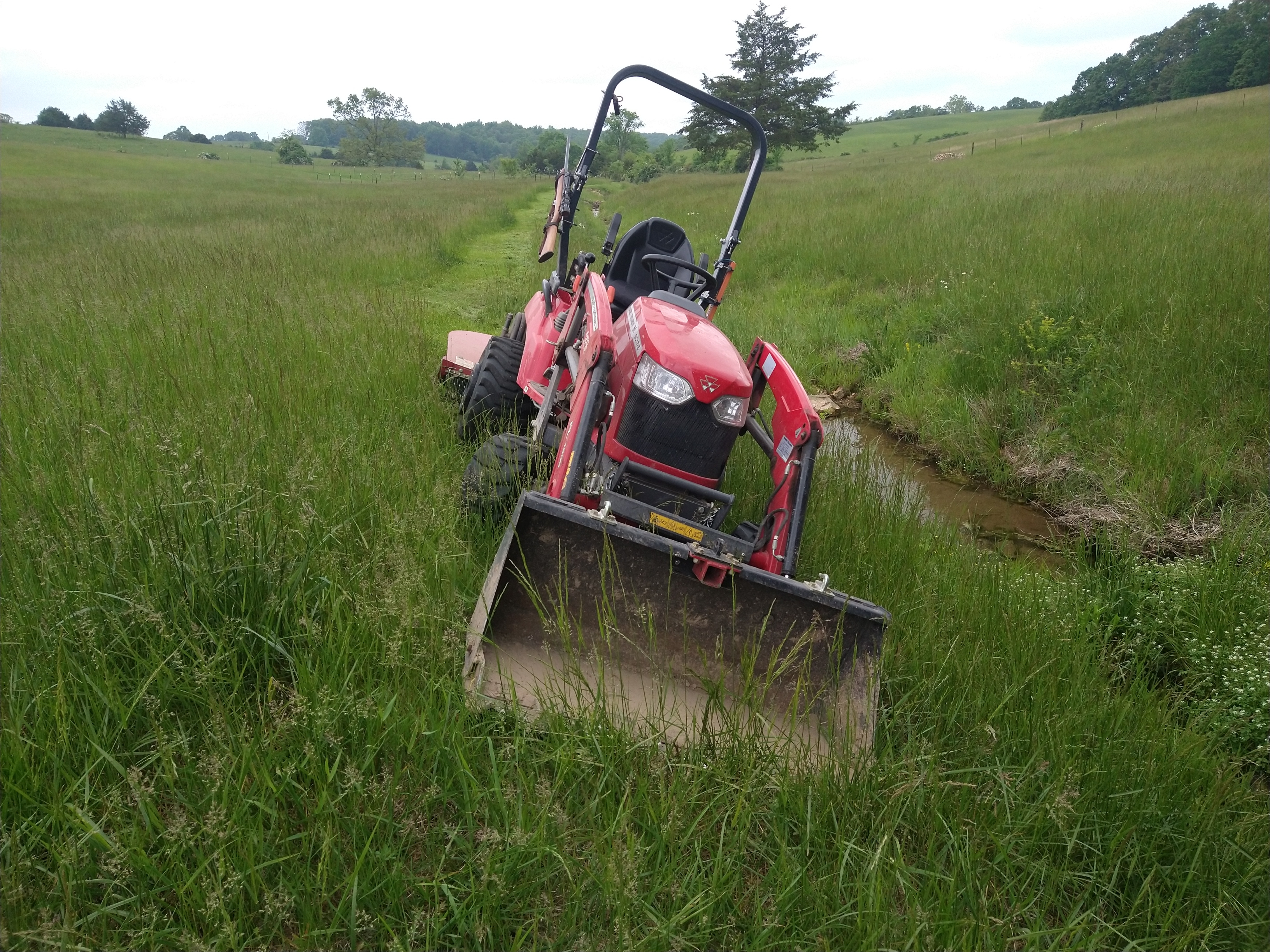 My "seat of the pants meter" went off at this point, my front tires wouldn't pull/steer up hill in 4X4 .. the 5' brush hog on the back is a bit heavy for it, and I had forgotten to put rocks in the bucket like I normally do for front ballast ...