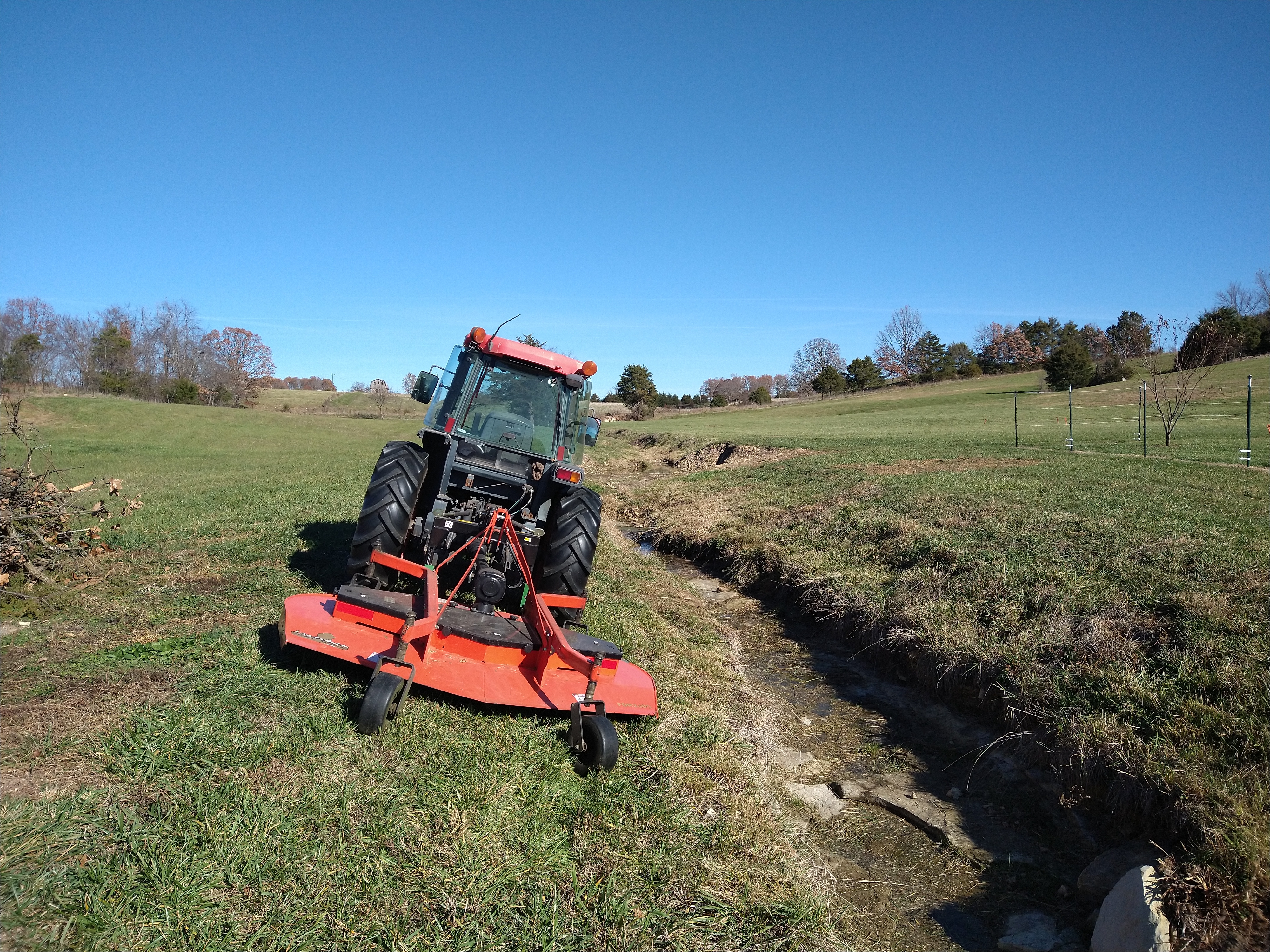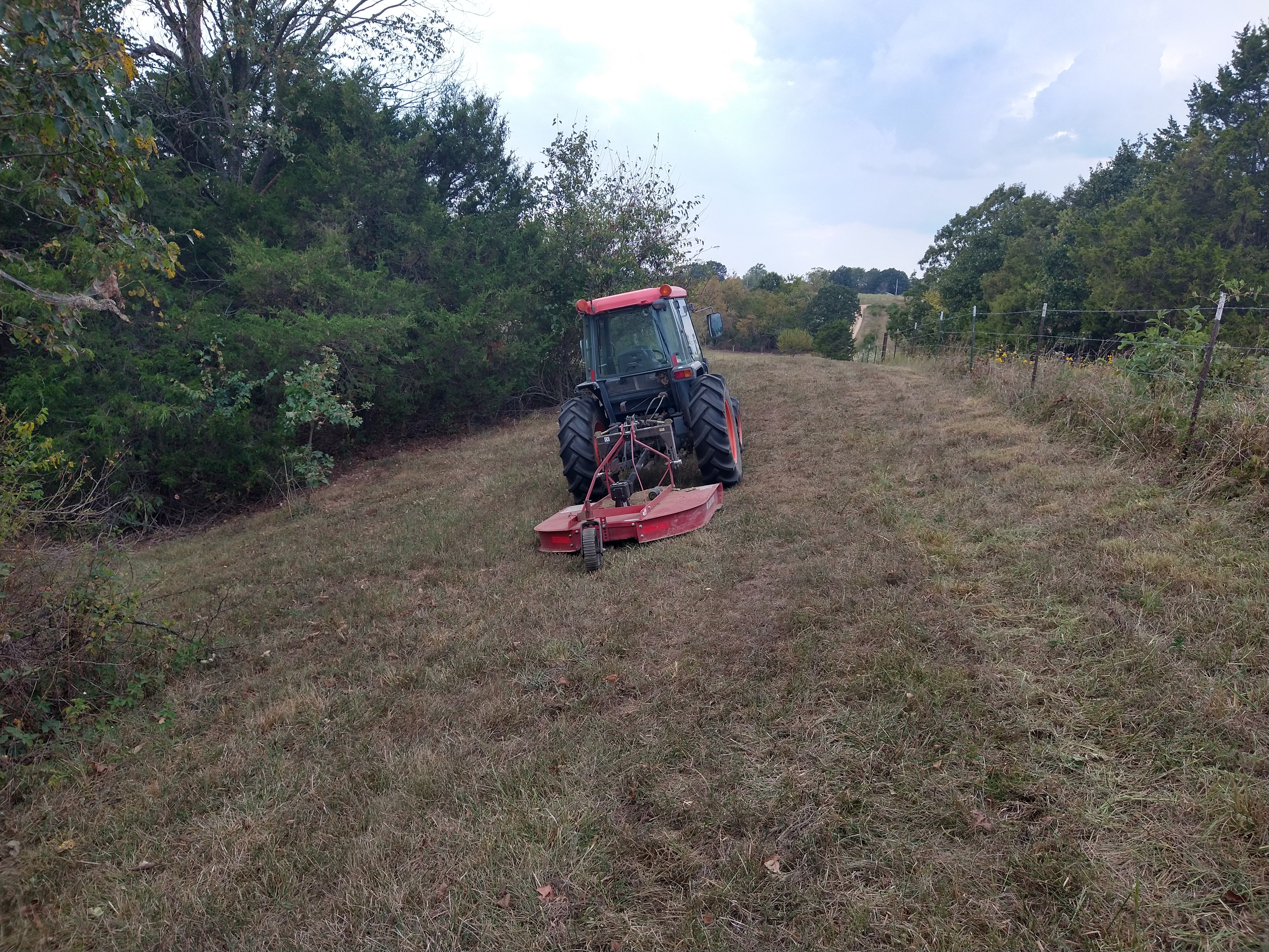 This next picture is the same place as the previous picture, the little tree near the rear tire is the same as the one 10' to the left in the previous picture, with the 5' brush hog I can mow this in 2 wheel drive, but with the 90" finish mower, I need 4X4 to pull it back up, it weighs twice as much, and all the weight is on the ground ... I mow sideways on the hill until I get to that little tree, then go up and down to get beside it ...