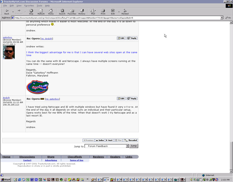 Am I the only one experiencing difficulty with Tractorbynet today and yesterday? I can use Netscape 3 4 5 no problem, if I try to use Explorer 3 4 or 5 with my Mac the program locks up and I have to force it to quit. Can access all other websites with Explorer as usual. (Using Mac).