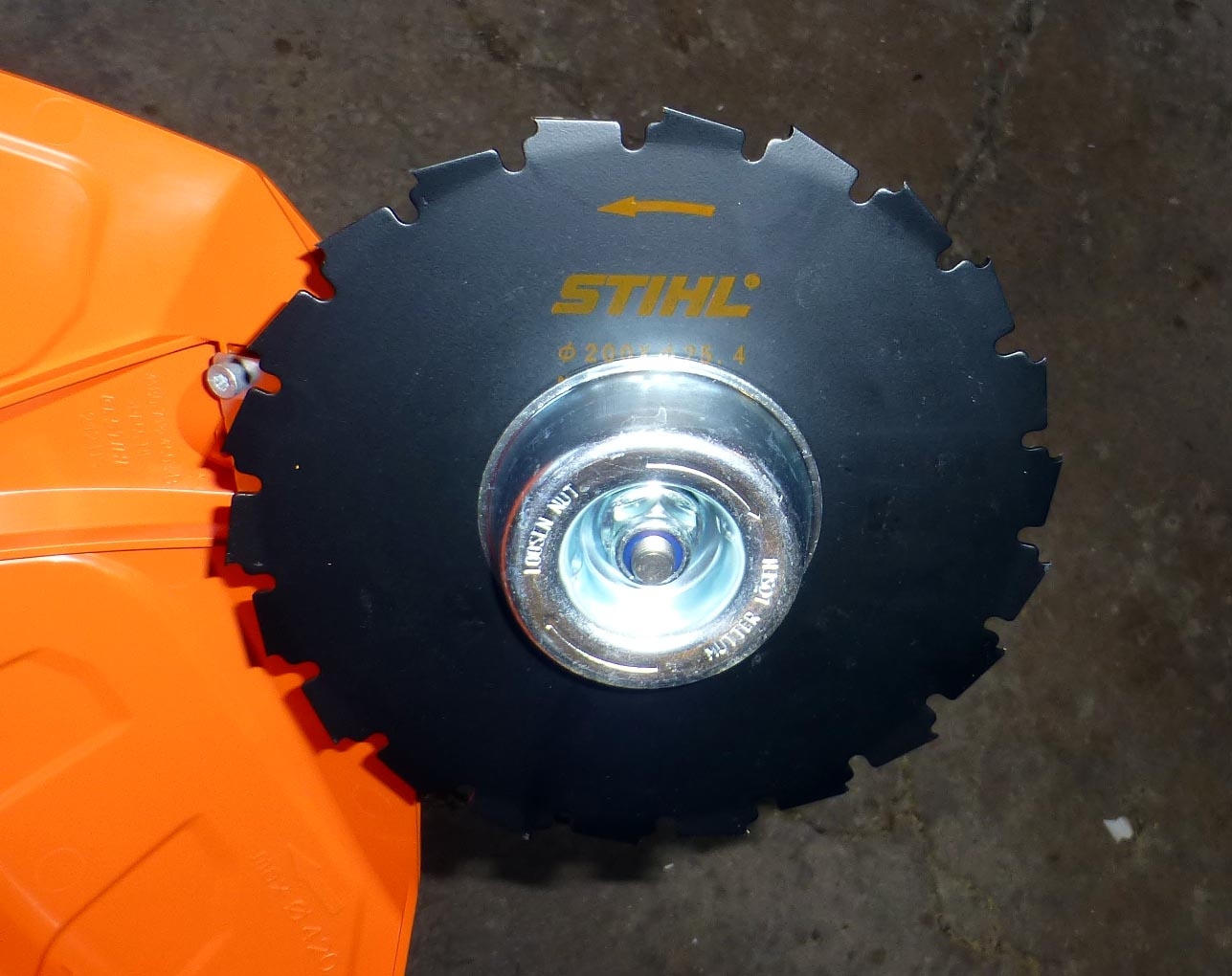 That large grass cutting shield will take a beating plowing through brush with a metal blade. The blade itself has an arrow for direction of rotation. In your second picture, note that your teeth are facing the opposite direction from the picture kenmbz posted.