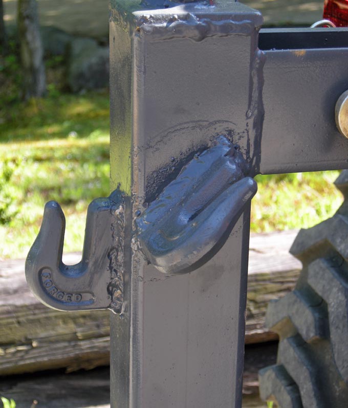 I have a TSC trailer mover that I use a lot. A friend welded some 3/8" grab hooks to it so I can use it to skid some logs out of the woods. When the 3 pt is down I hope to wrap a chain around the log and then the other ends through the grab hooks and then raise so the log is off the ground. Friend said the hooks would be strong enough.