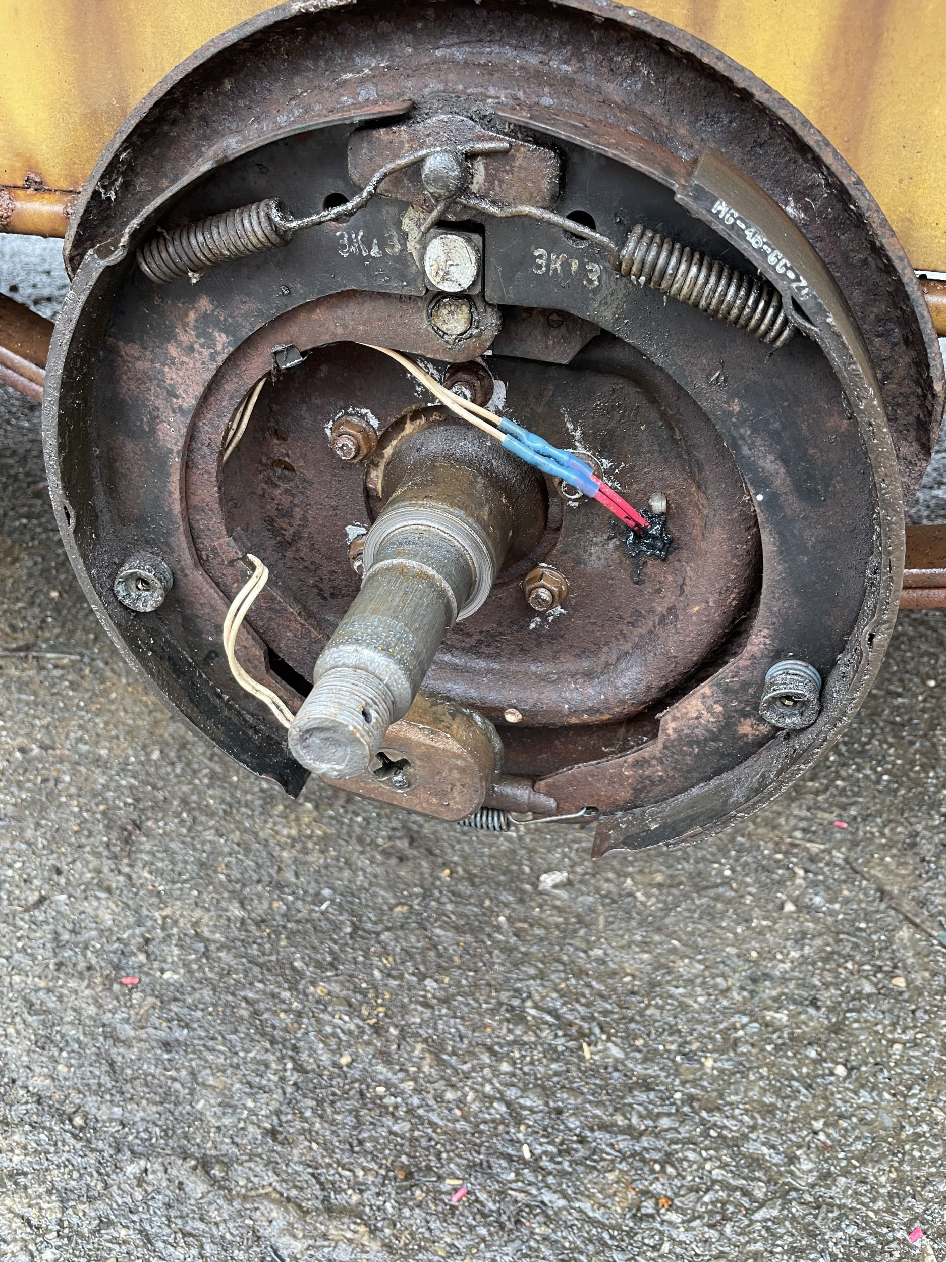 The brakes on the 10,000 lbs equipment trailer are not working. I do not use it often and the F350 dually has enough brake power when lightly loaded but would want to make it legal without a lot of expense. First problem was the connections on the wiring were twist on types or crimp types and no power to the brakes and some lights. Flipped the trailer over with the excavator and fixed all connections under the trailer with connectors with glue inside and when heated with the heatgun they seal pretty well. Now checking each wheel to see what I find. First one had broken wires inside the drum for the magnet. Spliced in some wires and tested the magnet. It works now so 3 more drums to go. IMG_0514.jpeg