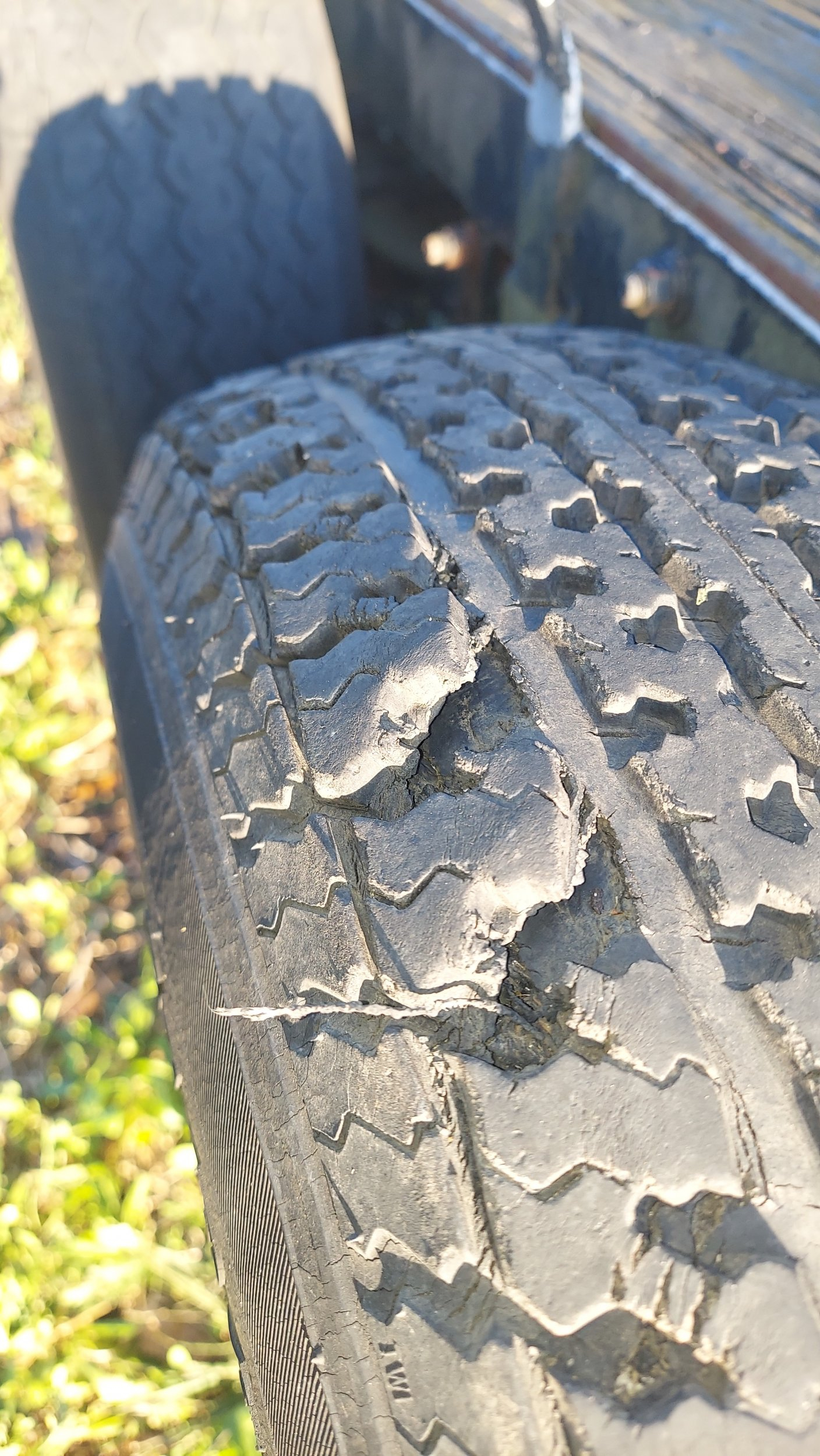 It's funny you should mention that. I was just looking at mine this week and noticed the same thing you mentioned. My trailer sits in the sun so I expect sunlight dry rot to an extent. The tires on the sunny side of the trailer are in better condition than the ones away from the sun. The odd thing I saw, not when the trailer was parked, but during the week it sat there unused, were chunks of tread coming off the tire on the 'unsunny' side, and it didn't look like that when I parked it. These tires are about 5 years old now probably, and surely do not have 500 miles on them yet. These ran approx $75/tire when purchased from a local tire store. Not sure what happened to this one over the course of this last week. When looking at it this close up it almost looks like there are belts breaking inside and it's just starting to come apart. Bet I don't get 100,000 miles out of this one.So I’ve never seen this before but pulled the trailer out yesterday to tow the small tractor to a job. Tires on one side perfect, tires on the other side both cracked really bad, not like dry rot, there was a line where I could see slight tread separation. I had already committed to the job so decided I’d take her as far as she’d go then road the tractor from there if I had too. Also all backcountry dirt roads so slow traveling and no traffic….still hated to be “that guy”. Long story short it made it there and back but I lost half the tread on one and a couple chunks out of the other. Anyone have any ideas what would cause one side to do that? Stored out of direct light mostly shaded so not like one side gets more exposure there. Checked pressures and everything was normal so not over pressured somehow. I use this trailer several times a month and didn’t see anything on my last walk around so was shocked last night.