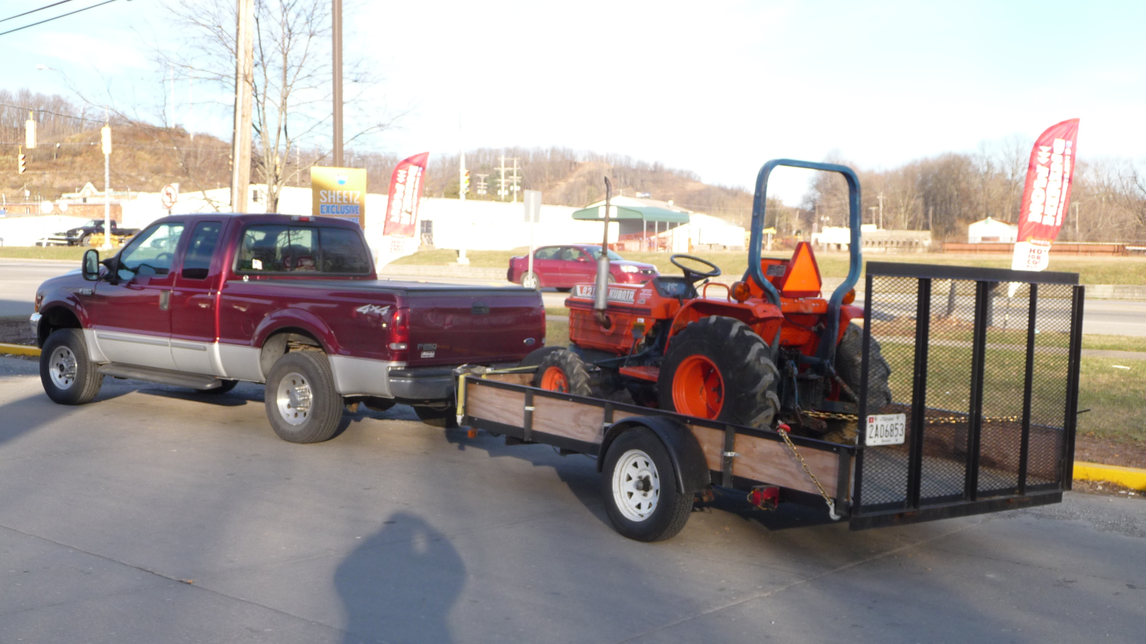 Here is BX2230 I hauled to a guy around 100 miles away in the Wash DC area. This is that same 6.5x12 trailer (which I had nursed back to useful life after it had been discarded by a landscaper.) In this picture I had not yet tied down the tractor. When I did it was with a very heavy strap in the rear attached to the tractor frame and another in front across the bucket and loader frame. Note i have plenty of tongue weight but it is pulled on forward. Zero problems.