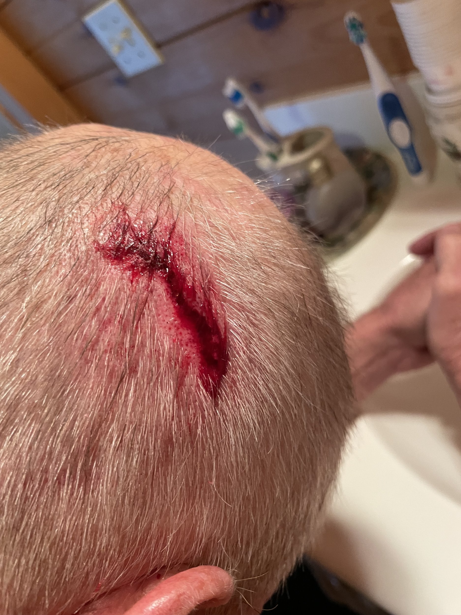 About three weeks ago I attempting to pull a dead ash out of a hedgerow on the north side of my property ! The tree had broken off at the base and all I had to do was clear a couple of small saplings out of the way to be able to pull the ash out ! After I cut the saplings I was attempting to pull them back in the woods while walking backwards! My boot must of caught on a branch and I tripped going backwards! That was all I remember until I came to ! I had blood all over my head, and I was able to make it back to the house, about 400 ft or so. My wife took me to the ER where they stapled my wound ! I had landed on a jagged rock and received a pretty good laceration!