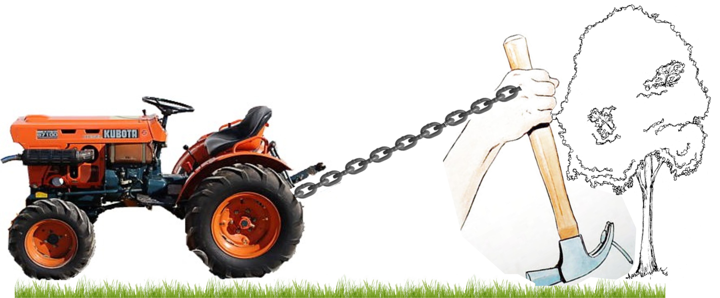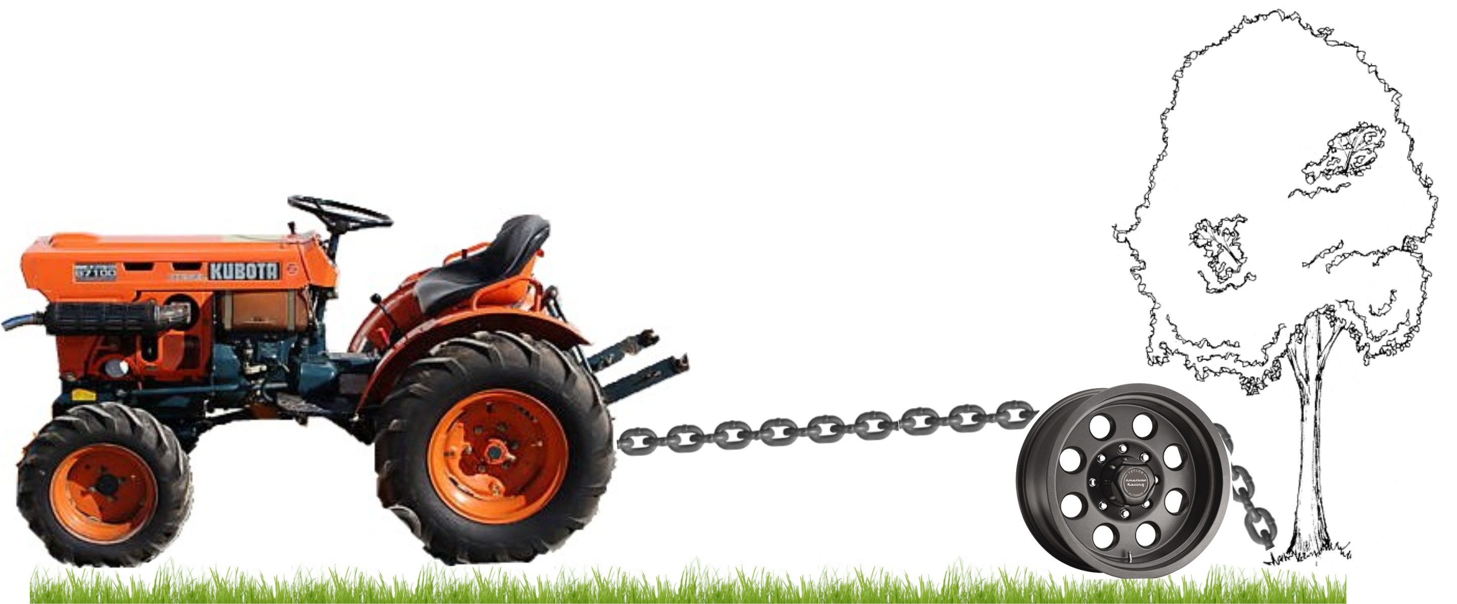 As mentioned previously, get the post as close to the tree as you can, and have your tractor pull the chain as perpendicular to the post as you can.