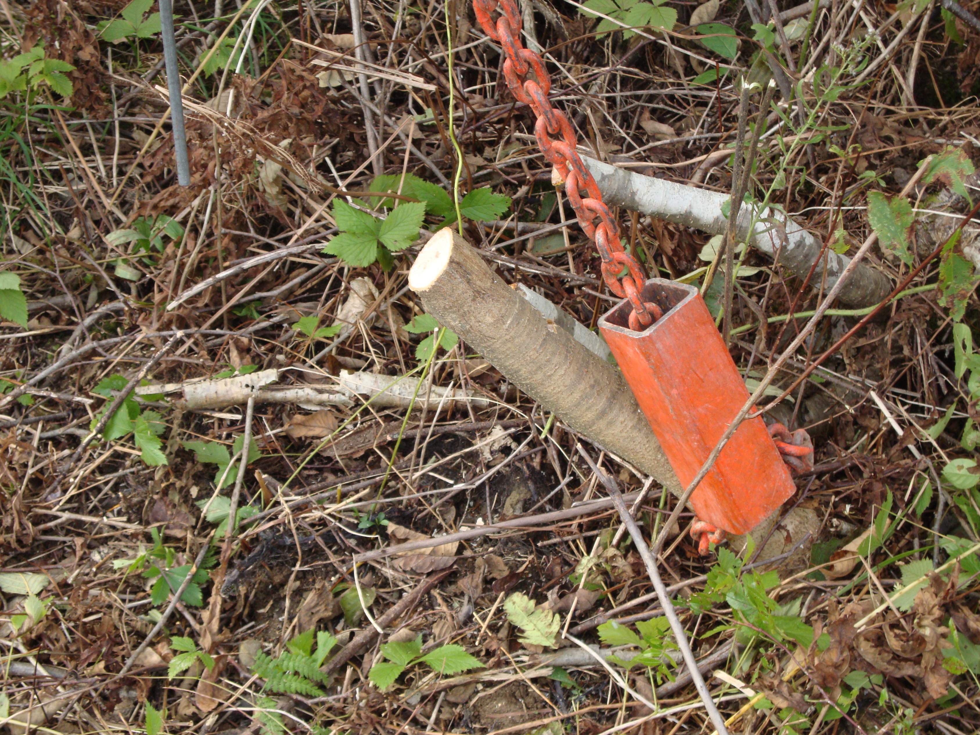 Shouldn't the pipe be reversed on the pull chain? I thought the point of this sliding pipe was to get the rim of the pipe sucked into the tree as the chain was pulled tight. In this drawing the pipe would be folded as the chain was pulled, and the smooth side (instead of the open rim) would be against the tree. That seems like it would provide less grip than using a chain wrapped around the tree without the pipe at all.