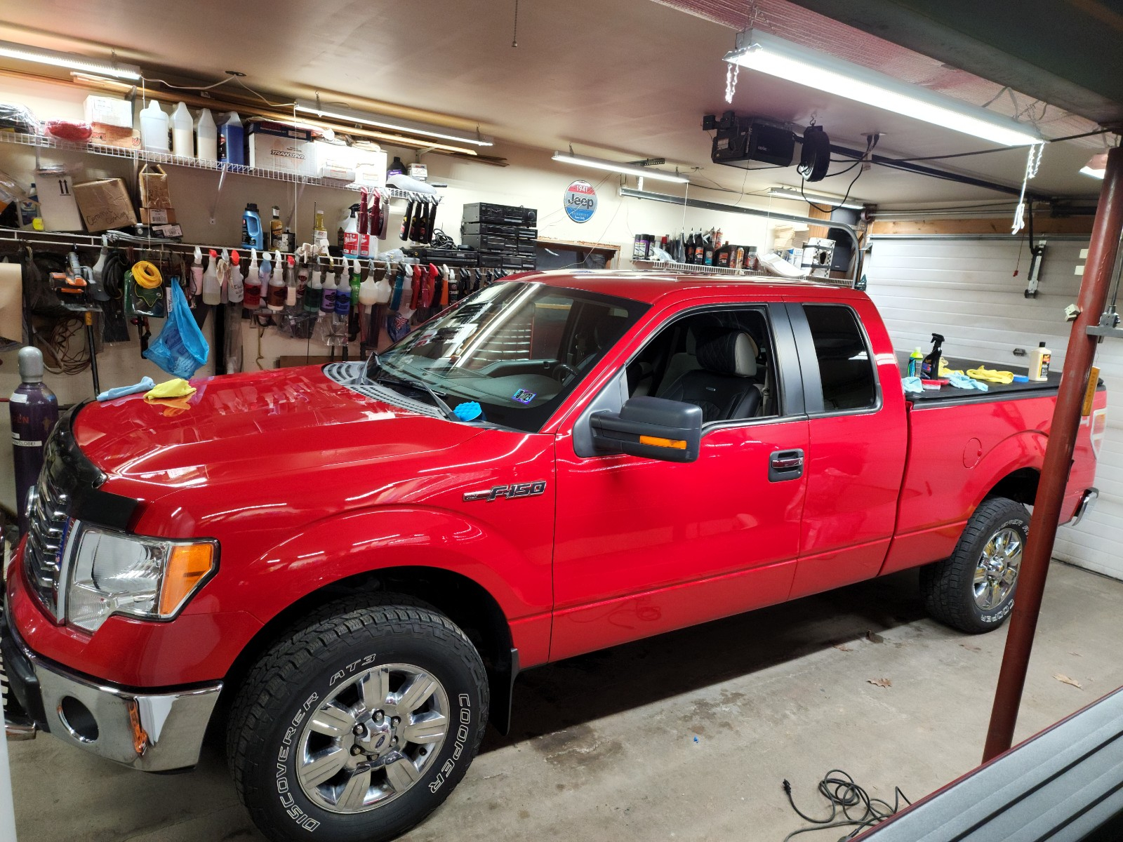 I just bought my son a 2010 F-150 XLT from lower WV, pretty decent shape, frame looks nice. Slight rust on the bed cross tubes, but the rockers, cab corners and bed sides are great. We are in the process of clay, compound, polish and ceramic enhanced sealant. He's 16, this is the first time he was willing to go into the garage and work on paint with me. I've been detailing and correcting paint for over a decade. I'm not a real big fan of ceramic coatings for people that like to take care of their paint and especially for people who like to do shows and look the best they can. Ceramic still swirls, still gets hard water damage and if you really want that show level paint, you will want to apply polish at the least LONG before the ceramic coating has failed. So if you want it to look near perfect, you have to work at that. To work it, you remove the coating. It takes the right person with good technique to maintain a swirl free finish over many years. There are two extremes that I see a ceramic working for. The nut and the lazy. I will explain as I go down the rabbit hole.
