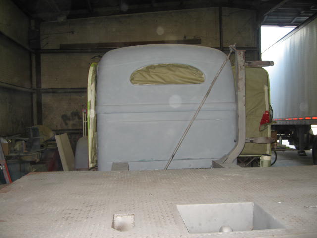 I visited the body shop today to check progress. They're finishing up the body work and plan to spray color Wednesday. They had sprayed a color sample of the White factory Cleveland Red and it's exactly the shade of red that I wanted. About all that's needed now is for them to pull the shutters and blast them and clean up a few places on the bed.