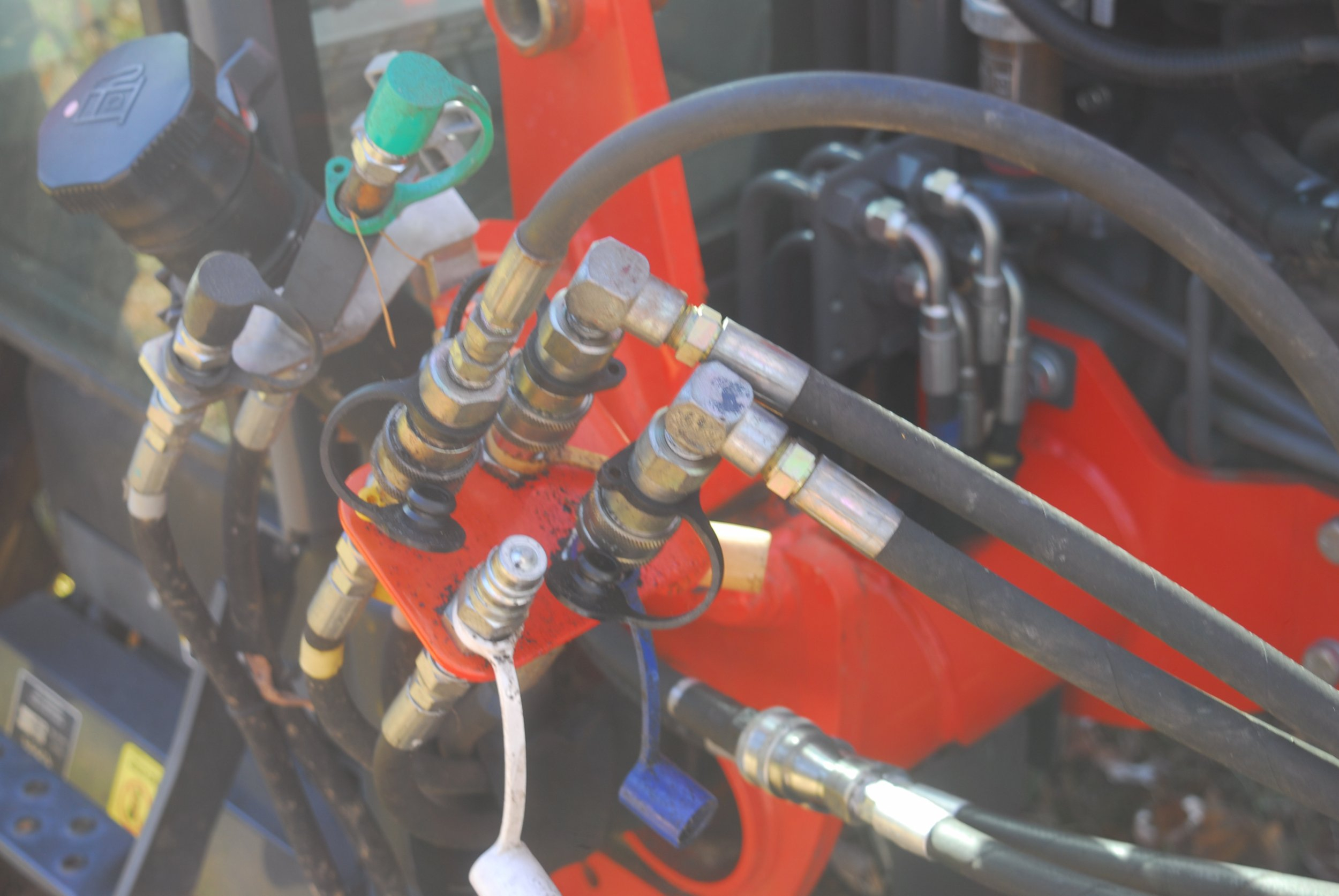 The plow was designed to be hooked up from the cab using a hydraulic cylinder to raise it into the truck mount. I made up a mount for the tractor and I use the loader valve to control the blade for power angle and lift. The mount cylinder is controlled by the same remote valve I use to control my grapple. Once the blade is mounted a pin is used to stop the cylinder from drifting.
