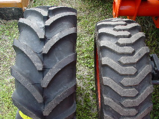 The biggest challenge was finding the proper front tires. Several radial rears are available that will work. The front tires are the ones that bury first in mud and are the ones that also scuff and imprint lawns. Therefore, I wanted a front tire that had a deep agressive R1W tread but which was also as big and wide as possible to get maximum flotation and minimum footprint pressure. But I also had to live within the constraints of the 4WD ratio calculations, available Kubota rim sizes, and physical interference problems with the Kubota FEL supports.