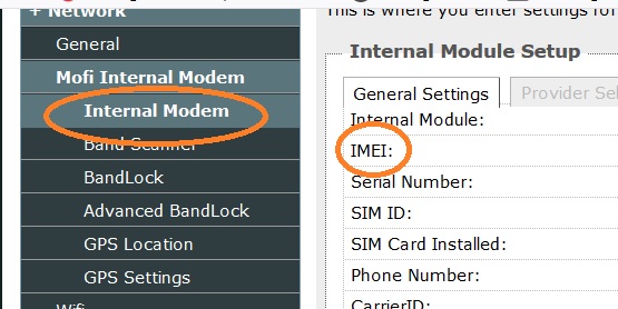 You'll need the IMEI number from the Mofi, you can get that by logging onto the Admin function of the Mofi and clicking on the Internal Modem Tab (as pictured)