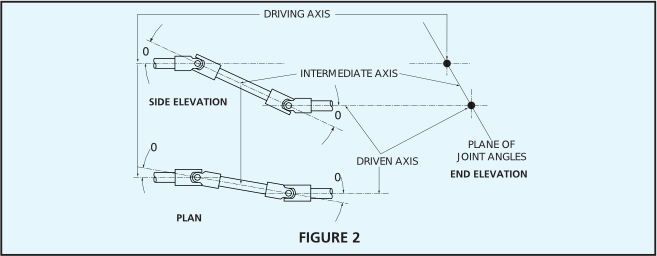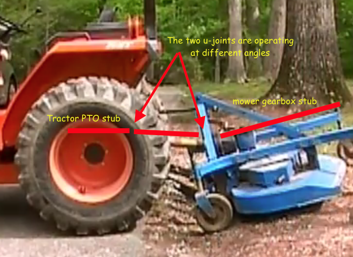 I believe the stated probable issue is a difference in angle of input and output shaft. They should be at 180°. I believe they are in normal operation. When the mower is lifted, that may change, although it shouldn't IMO if things are properly engineered.