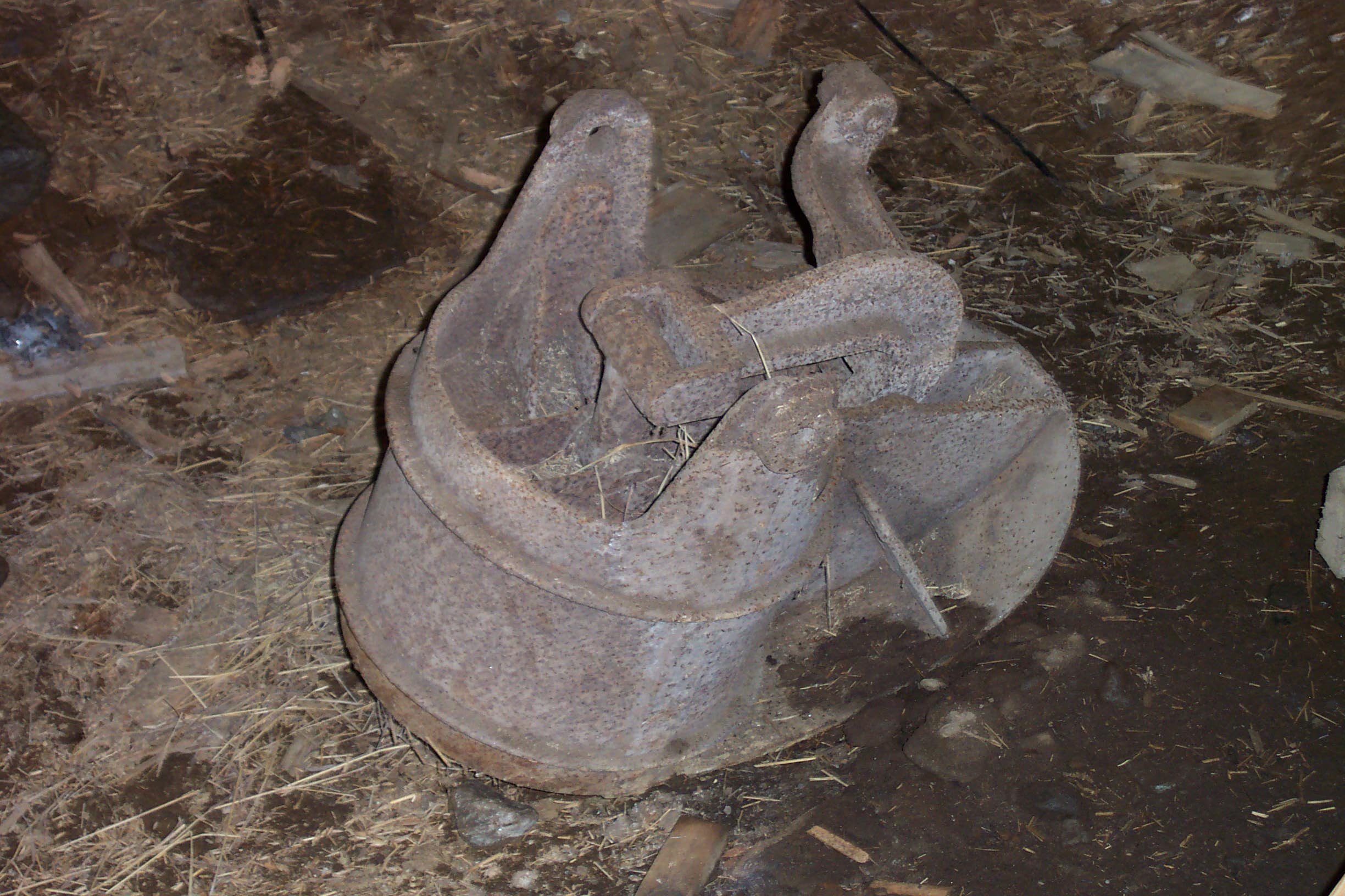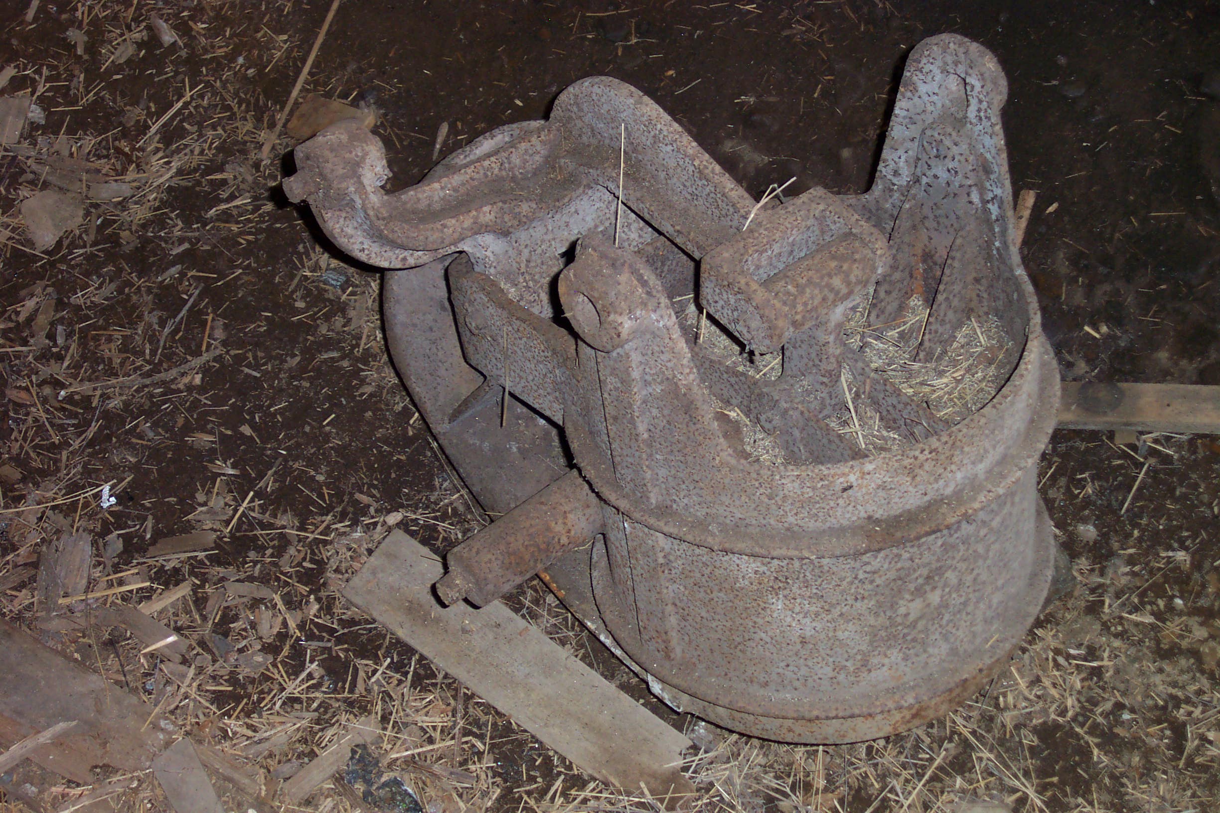 We found this in our barn located in Vermont our grandparents bought in 1931. It appears to have a plunger in the bucket and is keyed to keep it from binding up as it moves up and down. The plate that extends from the bottom of the bucket is convex like it is designed to move against another surface for sheering. We would like to know what this was for. DCP_1534.JPGDCP_1535.JPGDCP_1537.JPG