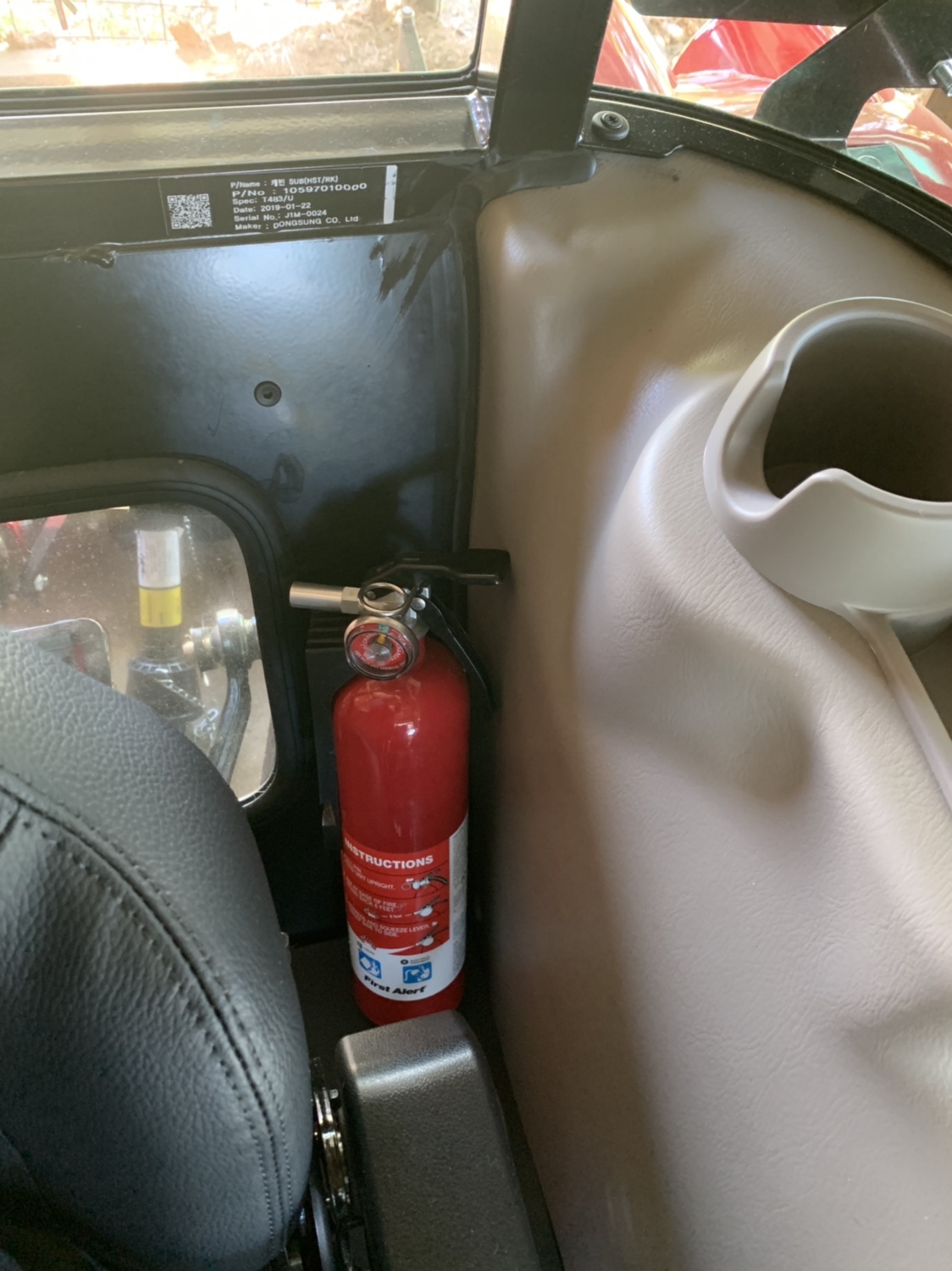 I mounted a fire extinguisher on the inside of the cab behind the seat. Something I think should be standard, but like boats, the stuff you think they should have (flares, etc), they don’t.