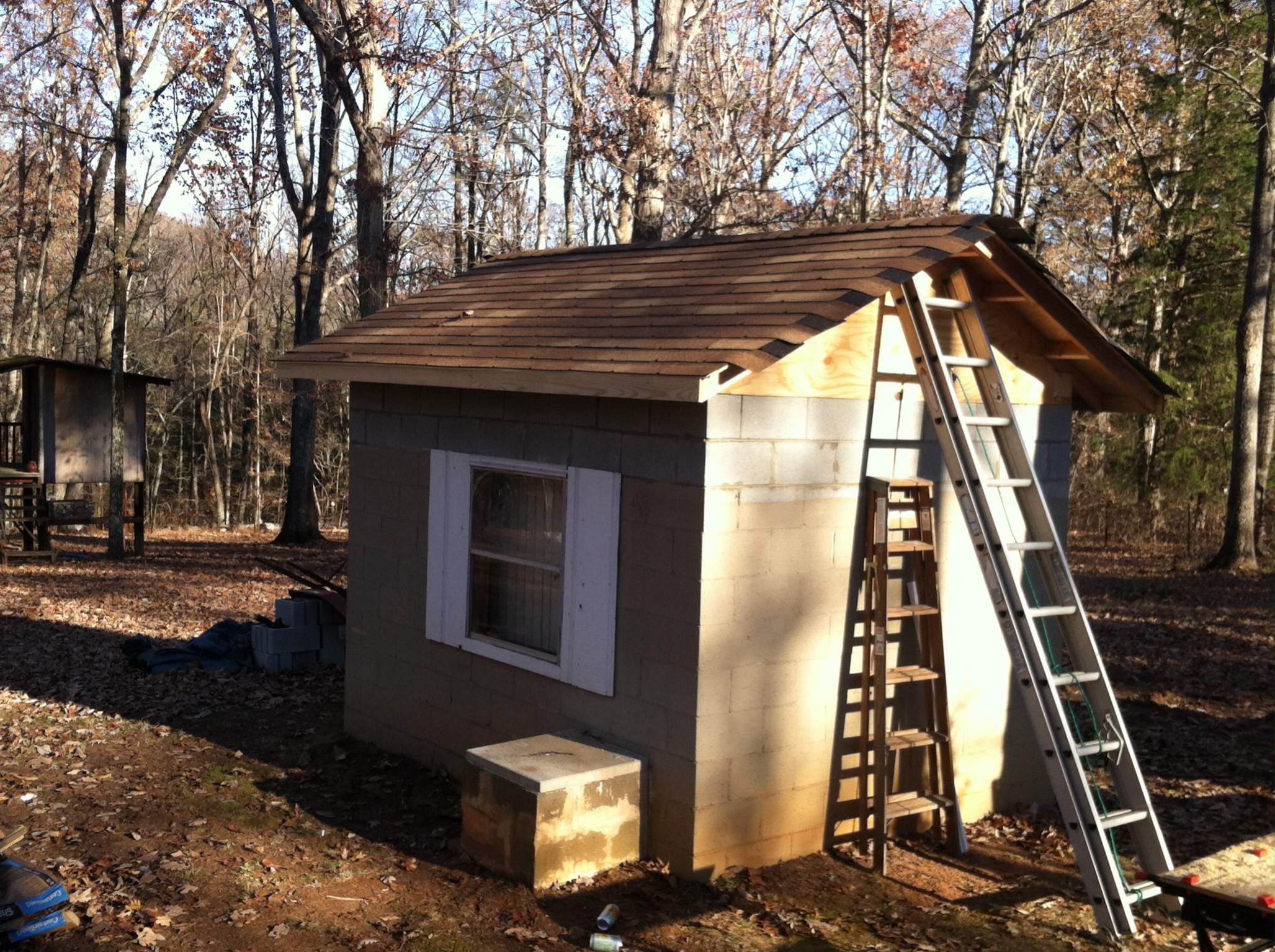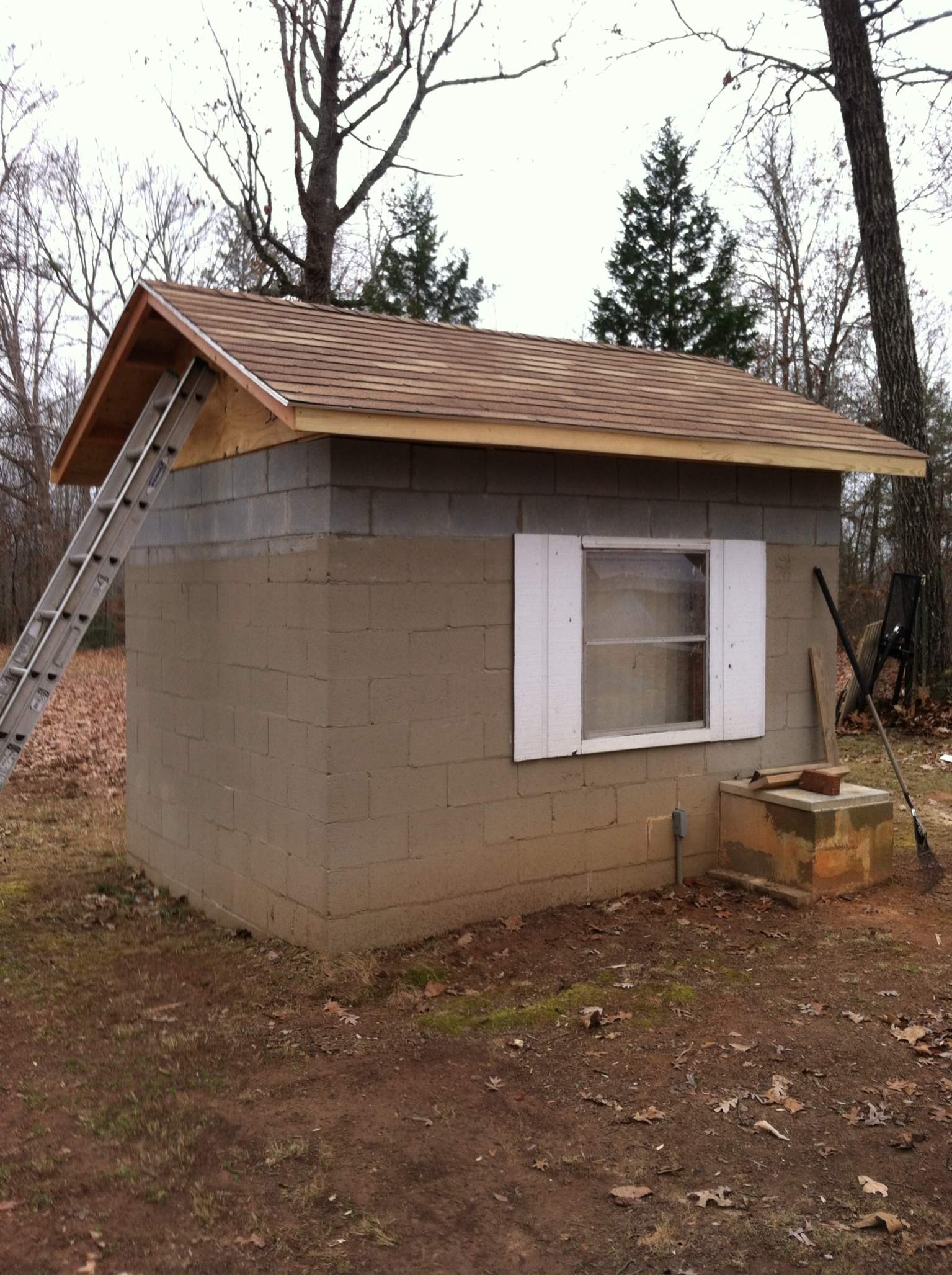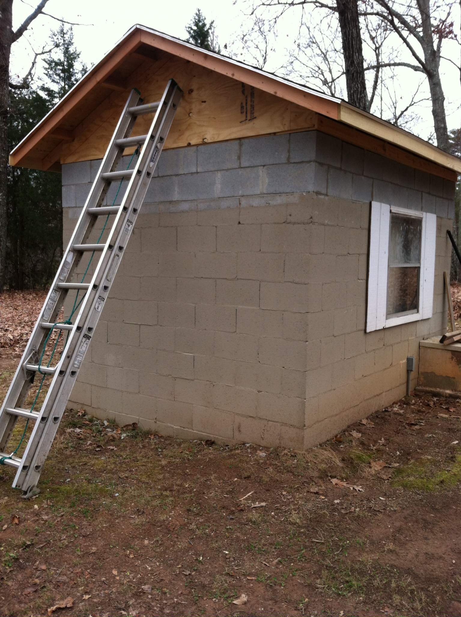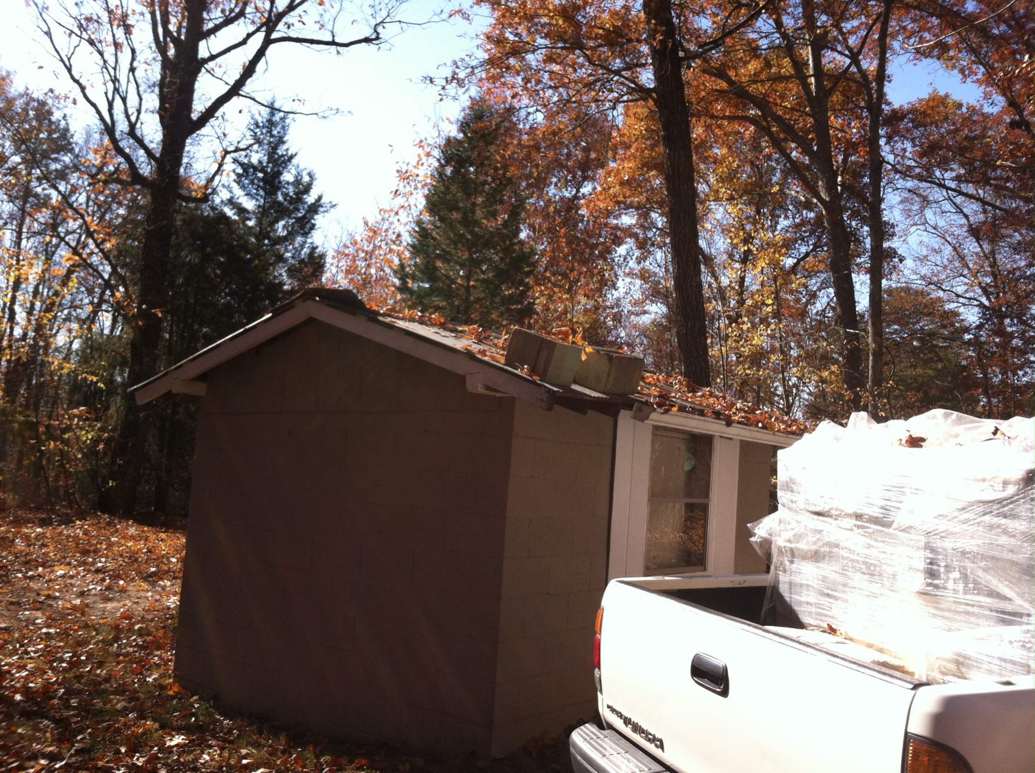 Started out as a 10' x 11' block building with 5V roofing over rotting wood. The 5V was loose and flapped in the winds so the reason there are cinder blocks on the BEFORE photo. Picked up 60 blocks and 6 bags of mortar from the local Lowe's. Was a bit more than I'd like to carry in my truck again. The blocks were heavier than I expected and they seemed to get heavier as the week progressed.