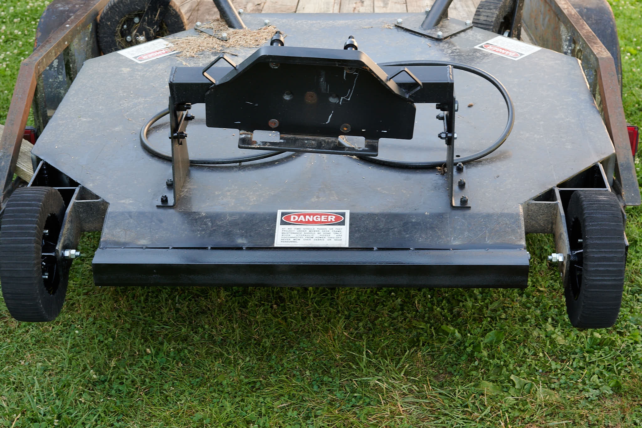 While I had the mower off the PT, decided to fabricate a debris guard. I meant to use chain, but wasn't comfortable with measuring the clearances needed to make sure the chain could never impact the cutting blade in any position. With the blade being so close to the deck anyway, I made a temporary guard just to see if it made any difference and how it might affect cutting performance.