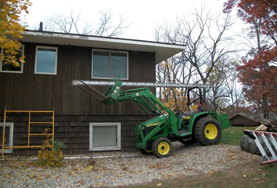 Used the FEL and the ROPS to hold the scaffold plank for repair of facia board.