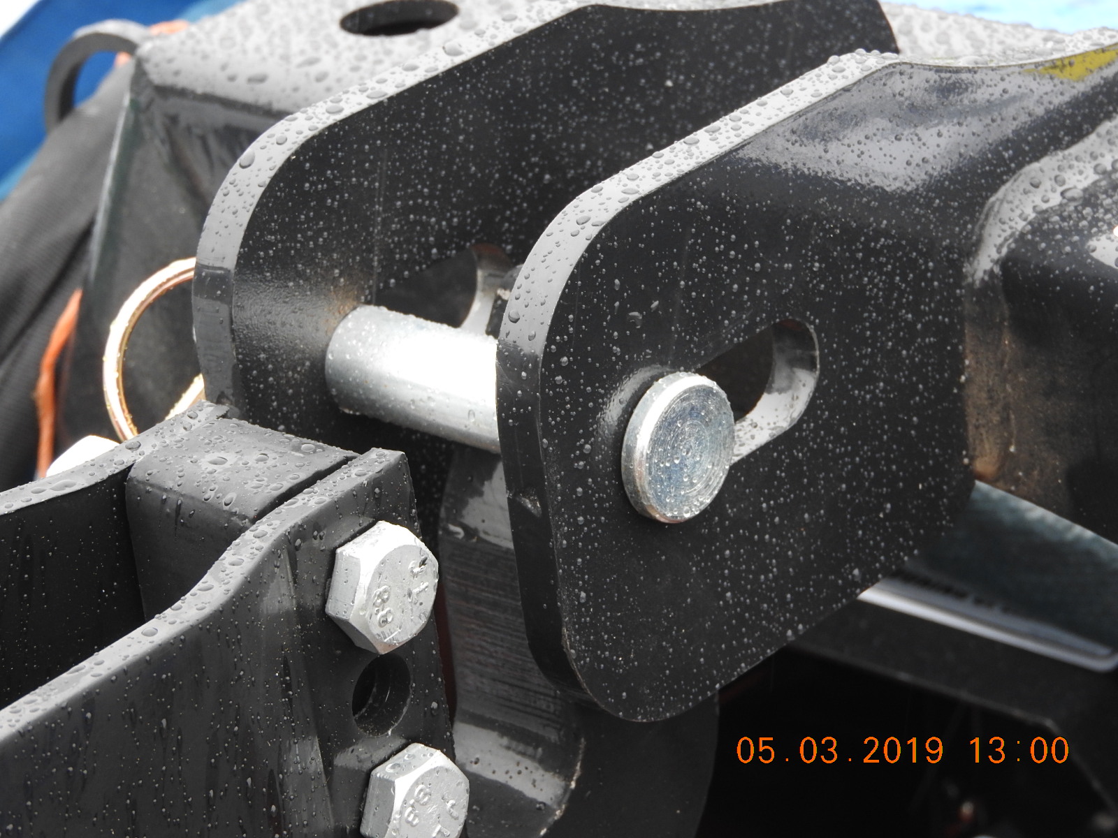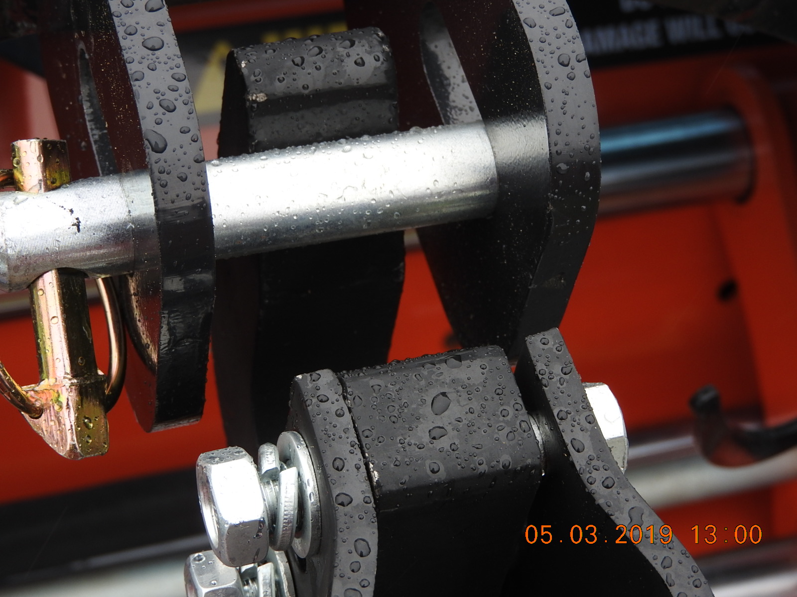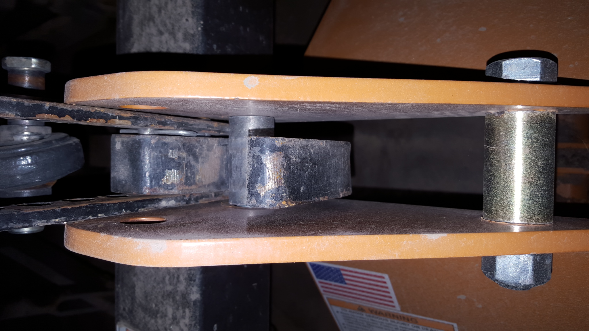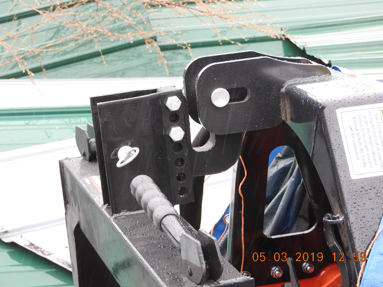 The top hook on the QH is in the top position, looks like if I lower it one pin hole and get the proper Cat1 to Cat 2 bushings it will fit the rake. BUT the vertical distance from the side pins to the top pin on the flail is about 20", the hook just barely touches the flail's top pin (trying things with the QH off the tractor) and it is on the curved part of the hook. The WoodMaxx manual says the flail is Cat 1 QH compatible (but not JD i-match compatible) so either there are no standards for QHs or HF's is way out of spec or WM is way out of spec. The top pin in the flail rides in a horizontal slot, no vertical adjustments possible.