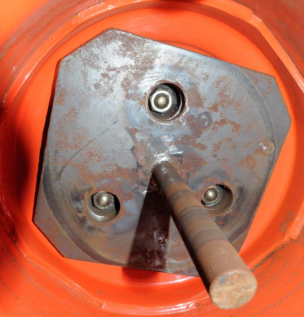 I cut 11" off each end of the barbell and had a local shop punch a 1" hole in the center of a 5" x 7" x 1/2" plate to receive it. They also punched some u-bolt holes. I welded the stub a little shallow in the hole so it laid flat and put a little weld around the top of the plate as well.