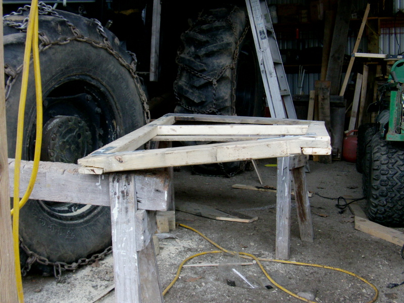 I wanted an door on one side and as you can see, had to make a strange shaped bottom to make it fit the 2 different angles of the cab supports. Door corners are just lap joints screwed, glued and with metal corner brackets. The windshield is an escape window out of a Verizon service van and the awning over the windshield is just a piece of OSB that will probably be replaced with metal or plexiglass next year.