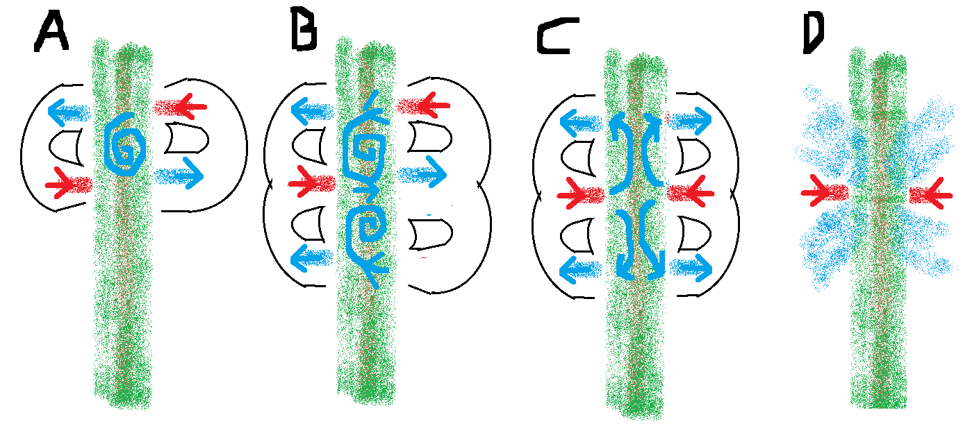 A = single vortexing current created. spray heads on each side (red), are not directly across from each other. but are separated... say 4 to 6 feet apart. each set of spray heads also has a "fan"'s more likely multi smaller fans. to create additional air current.